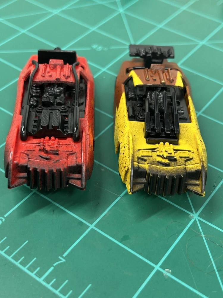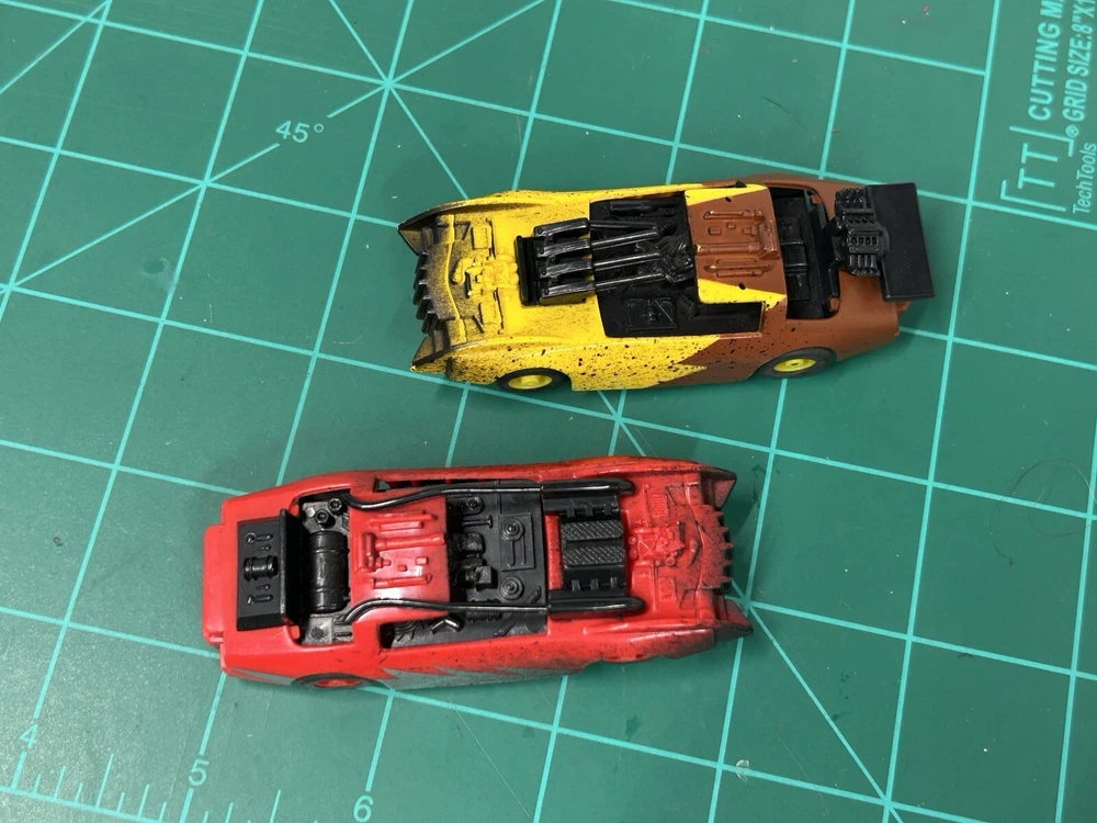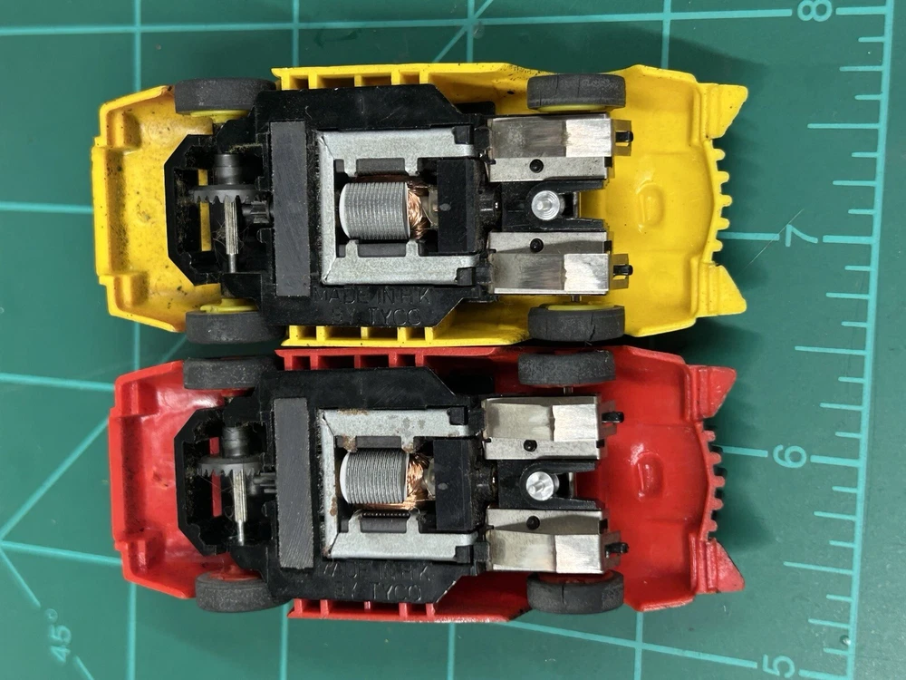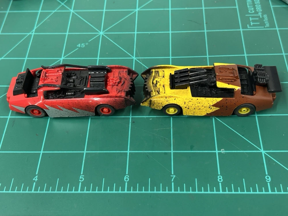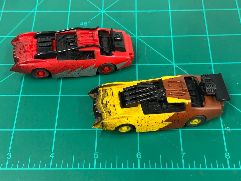 These rare Tyco Doomsday Duel set Cars are a must-have for any slot car enthusiast. With HO scale cars that can run on AFX tracks, this set is perfect for collectors and hobbyists alike. The brand, TYCO, is known for producing high-quality slot cars, and this set is no exception. These are perfect for those who want to add to their collection or for those who want to start a new hobby. The cars are designed to be compatible with other HO scale slot cars and can be used on most tracks. These cars are hard to find and is sure to make a great addition to any collection.