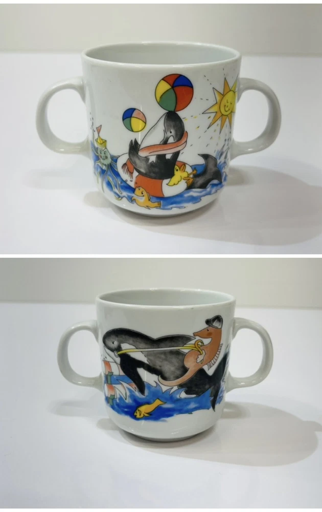 The unique sea life killer whale being ridden by a seahorse t wo handle Villeroy and Boch mug is designed by Gallow, it is in good condition with no chips and or cracks .