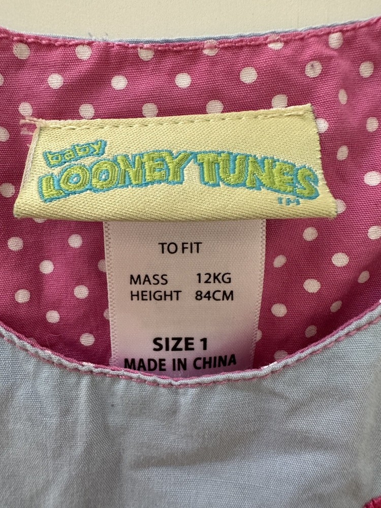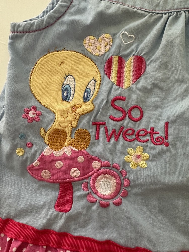Number of Pieces:1 PieceSleeve Length:SleevelessSet Includes:DressType:DressCharacter Family:Looney Tunes, tweety birdColour:BlueVintage:YesMaterial:100% Cotton, CottonBrand:Looney TunesCharacter:TweetyAccents:EmbroideredSize:1Color:blueDepartment:GirlsStyle:dressTheme:90s, Baby Shower, Cartoon, TV & Movie Characters