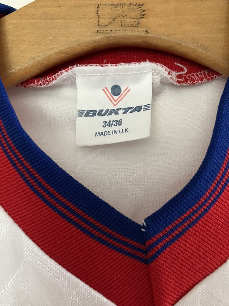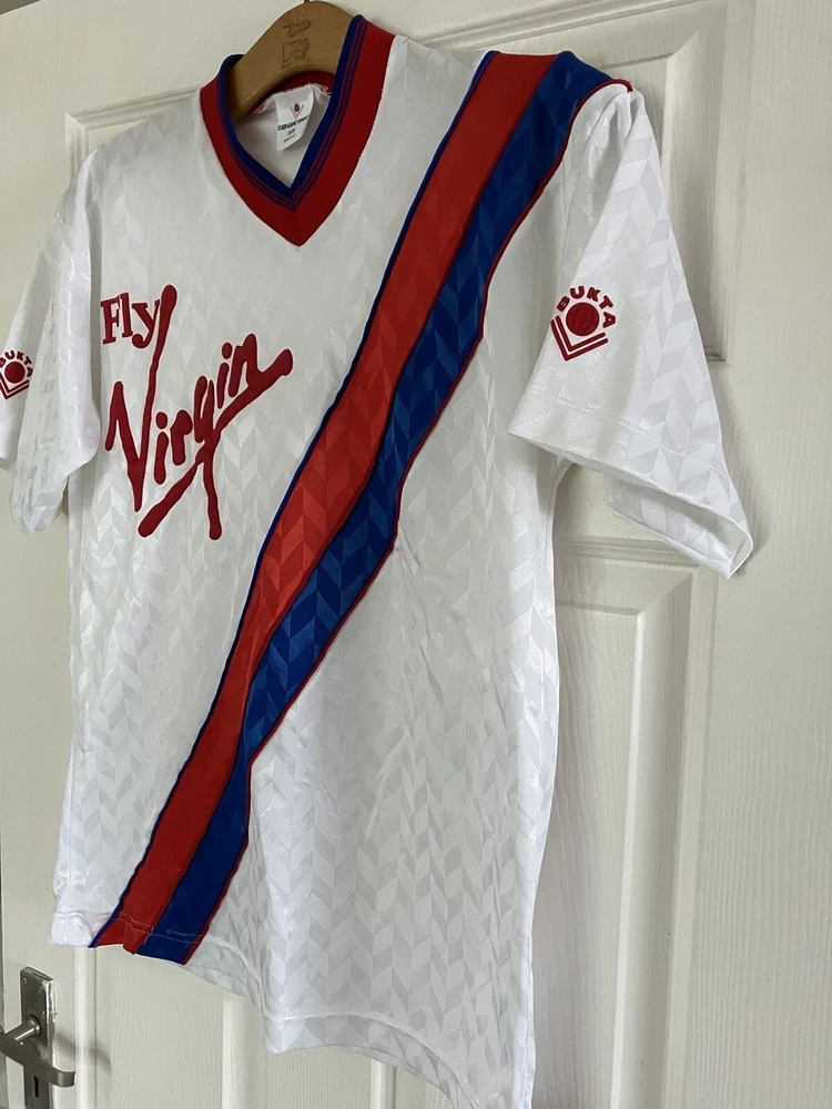 Rare Vintage Bukta Crystal Palace 1989/1990 Away Shirt Size 34/36 Small. An absolute beauty of a shirt, the famous palace sash which is an absolute classic among fans. Considered to be one of the favourite away kits in history. You may be thinking where is the badge? I certainly was but I’ve been told this kit had the club badge on the shorts and you had to sew or iron the badge on yourself. The person who owned this shirt obviously chose not to. I checked other shirts and it seems the badge is frequently on a different area on most shirts and not in the identical place on other shirts so it would make sense. Obviously if anyone has more information I would be grateful. Everything else is identical so that reason would very much make sense to me. While it would be nice to have the badge on for me it gives it a unique feel and you can’t beat an original shirt with some history behind it. This is a used item and given it’s age is in excellent condition, tried to take good pictures for condition. Abit of loose stitching to the bottom right corner but small bobbling and stitching loose are to be expected given the age. Label states 34/36 and I’ve added measurements to pictures. I would say it was a size small and the shirts were quite fitted back then. From a smoke and pet free home. Any questions feel free to get in contact and I’ll help as best as I can!