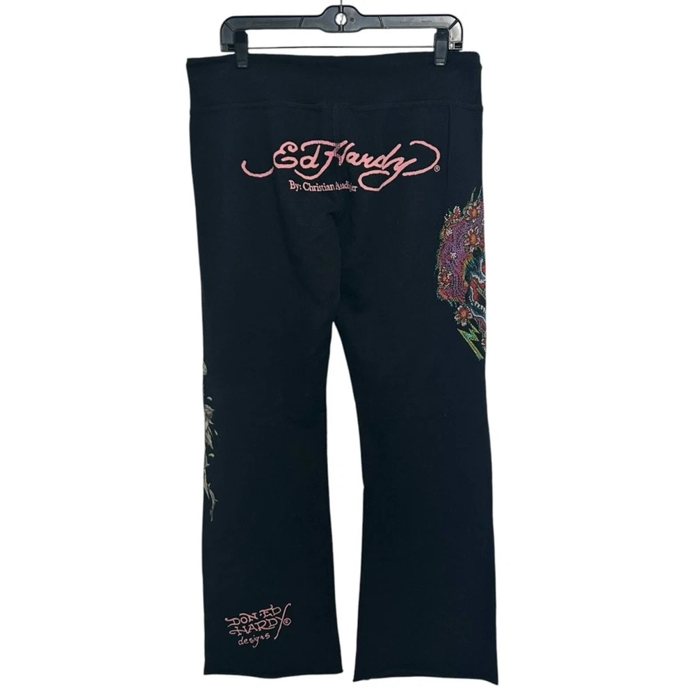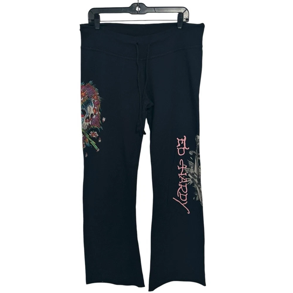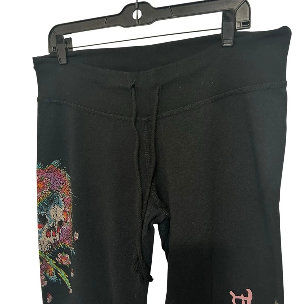Women’s pants, lounge pants, sweat pants Ed Hardy Mid rise Drawstring 100% cotton Bedazzled skull design Rare vintage item, in good used PreOwned condition