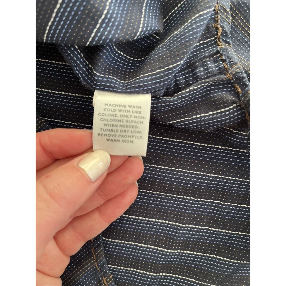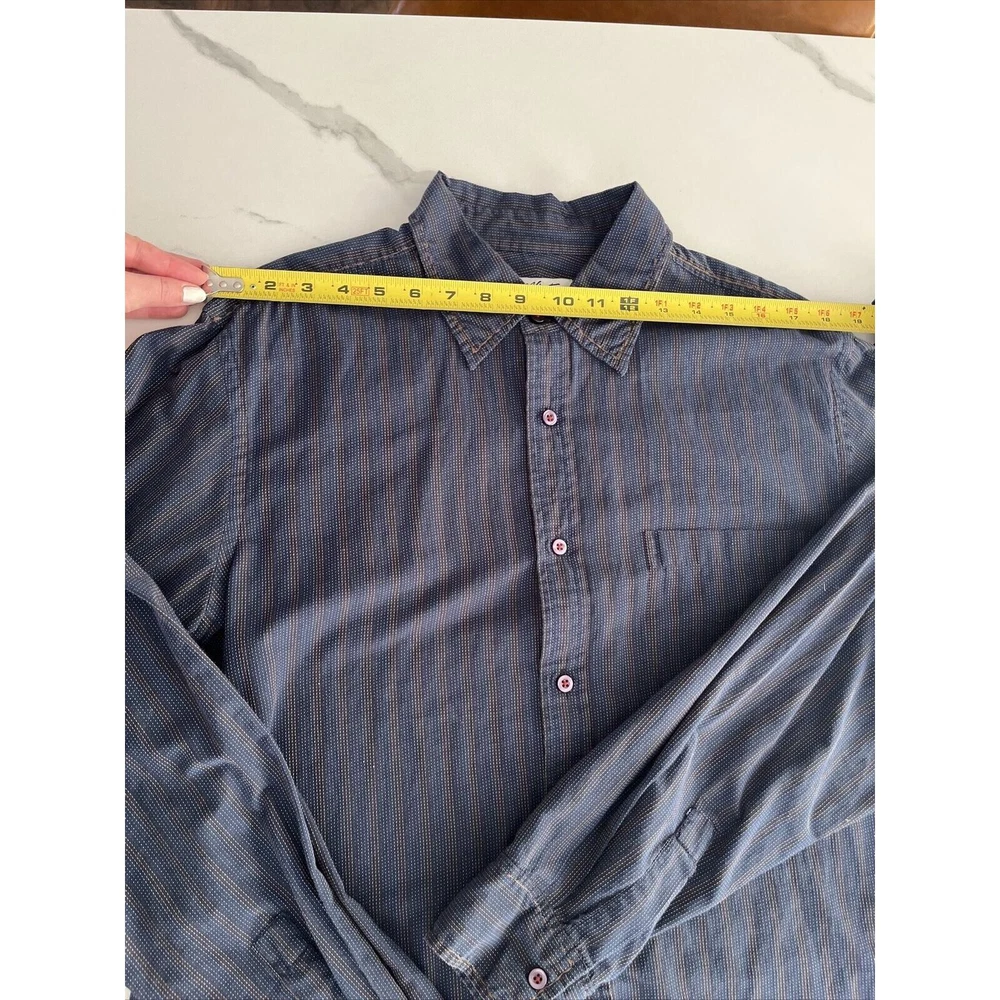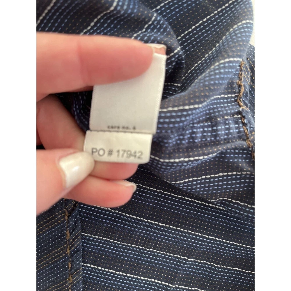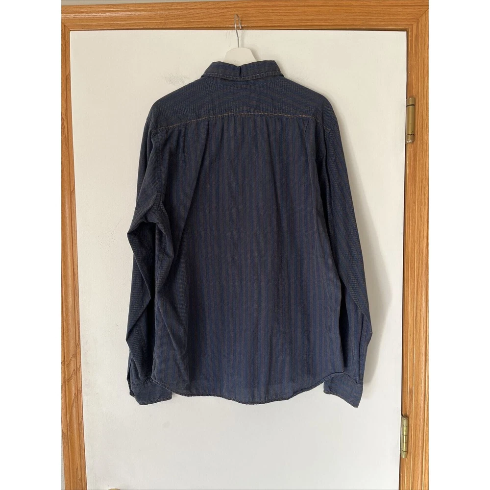 This rare vintage men's button-down shirt features a blue and tan striped pattern and long sleeves with buttoned cuffs. The collared neckline and buttoned closure add to the classic and versatile style, making it perfect for travel, casual outings, or business settings. The shirt is machine washable and made of a comfortable knit fabric consisting of polyester and cotton. It also includes accents such as pockets, and the cowboy-themed design adds a unique touch. The shirt is labeled as a size large and has a regular fit for a comfortable and flattering look. This shirt is a great addition to any wardrobe and is perfect for the winter, fall, and spring seasons. Excellent condition! See photos for measurements.