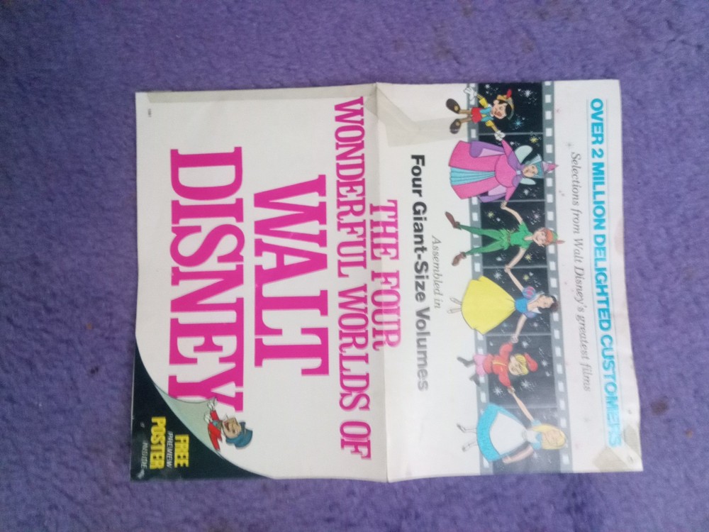 This rare vintage Wonderful World of Walt Disney Preview Poster from the 80s is a highly collectible piece featuring all the original Disney characters. This poster is advertising a new line of posters coming out in the 1980s. this is a preview poster to showcases the iconic Disney franchise and is a must-have for any Disneyana enthusiast or collector. With its nostalgic charm and historical significance, this poster from the 1980s is a unique and special addition to any Disney memorabilia collection. The condition is used it has fold lines and two corners have been ripped off. The other two corners have tape marks all in all the condition is fair considering the age and rarity of this poster that was meant to be looked at and thrown away with the hopes of making the viewer want to buy a new poster from this line. I only have one and have not been able to find an exact copy of this poster anywhere else so first come first serve.