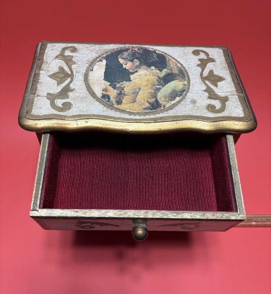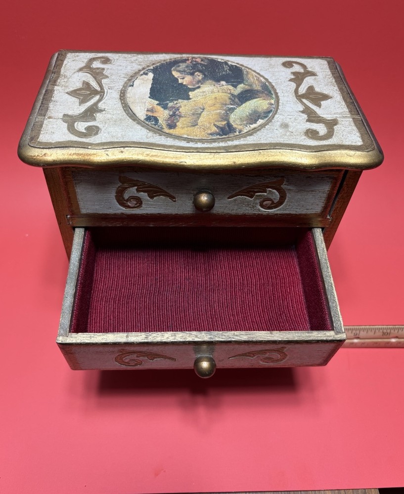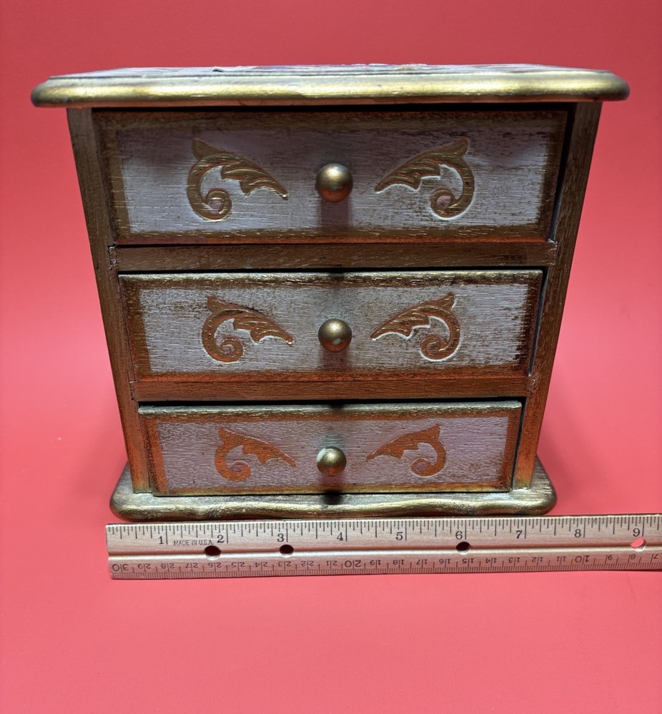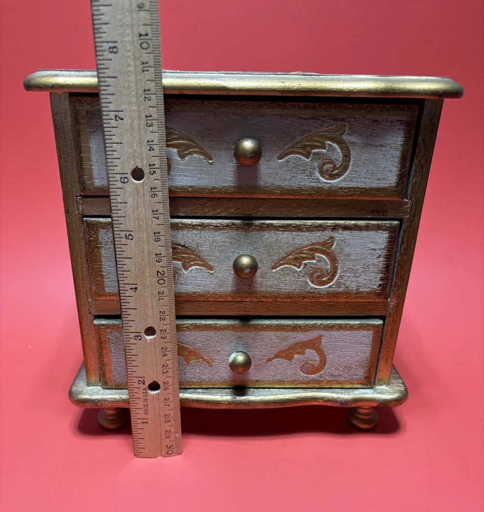 This beautiful vintage jewelry box is perfect for storing all of your precious jewelry items. With three drawers, it offers ample space for necklaces, bracelets, anklets, rings, cufflinks, earrings, and body jewelry. The box is made of high-quality wood with a gold color and features a velvet lining for added protection. The box also has a musical feature, allowing you to enjoy your favorite tunes while admiring your jewelry collection. Its rectangular shape and storage box items make it suitable for any bedroom or dressing table. This rare vintage piece was made in Italy and is sure to be a cherished addition to your jewelry collection.