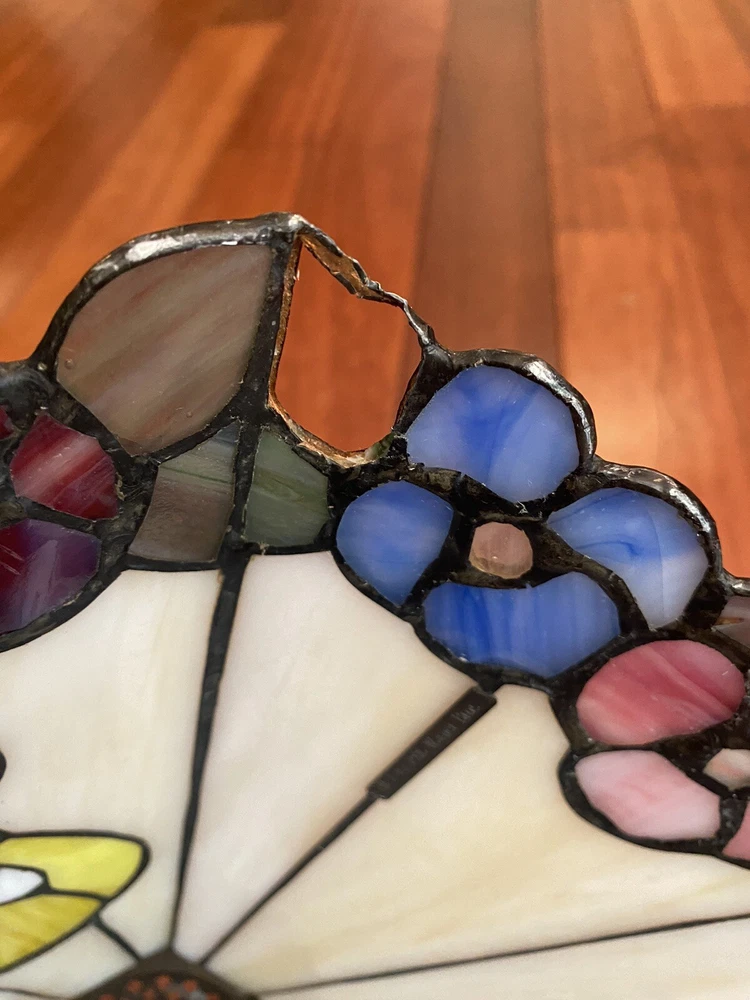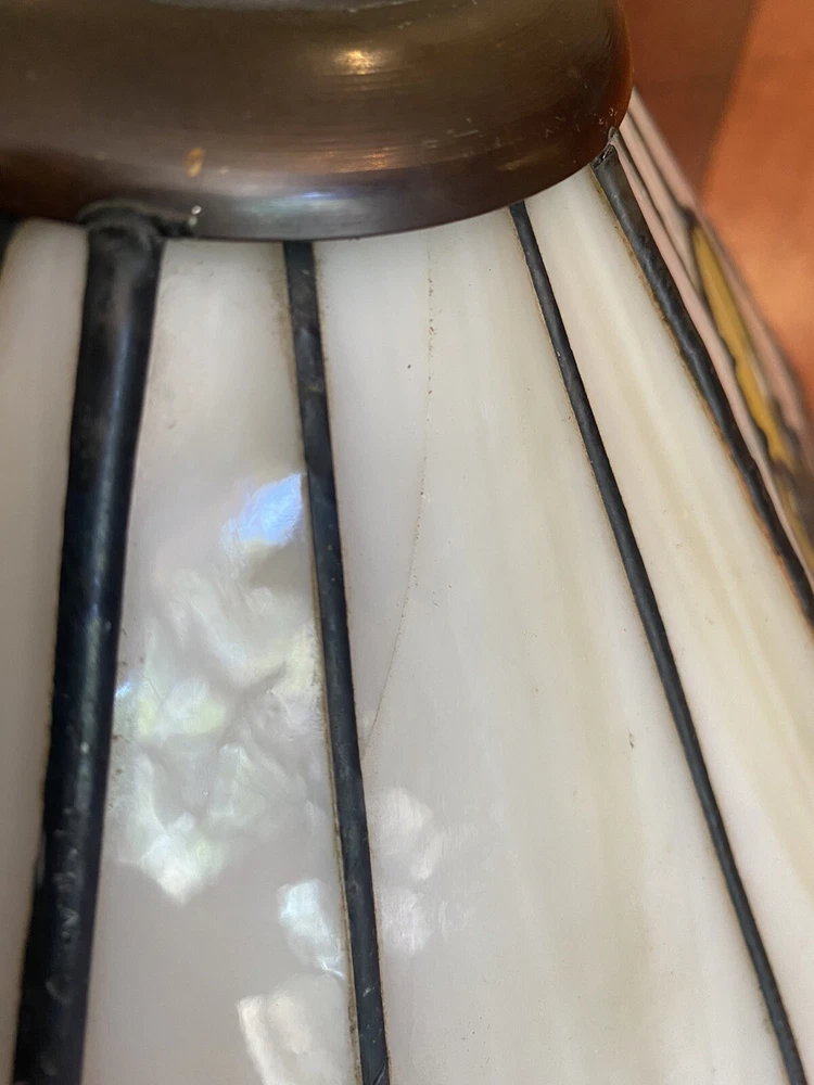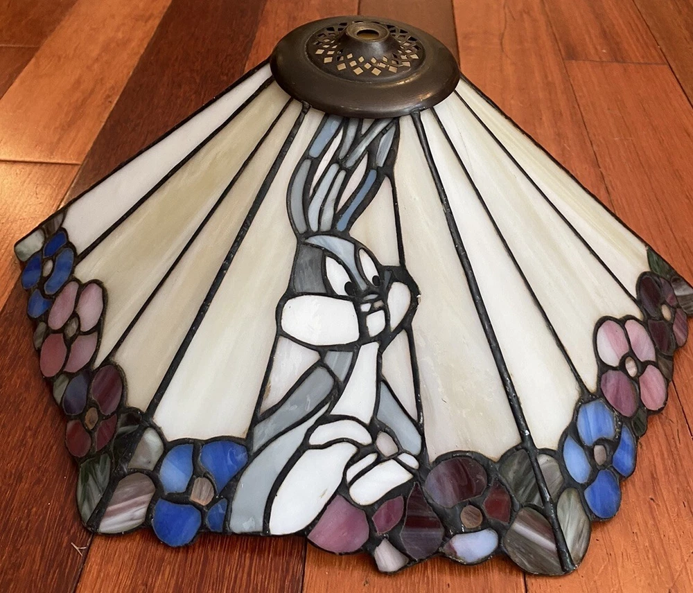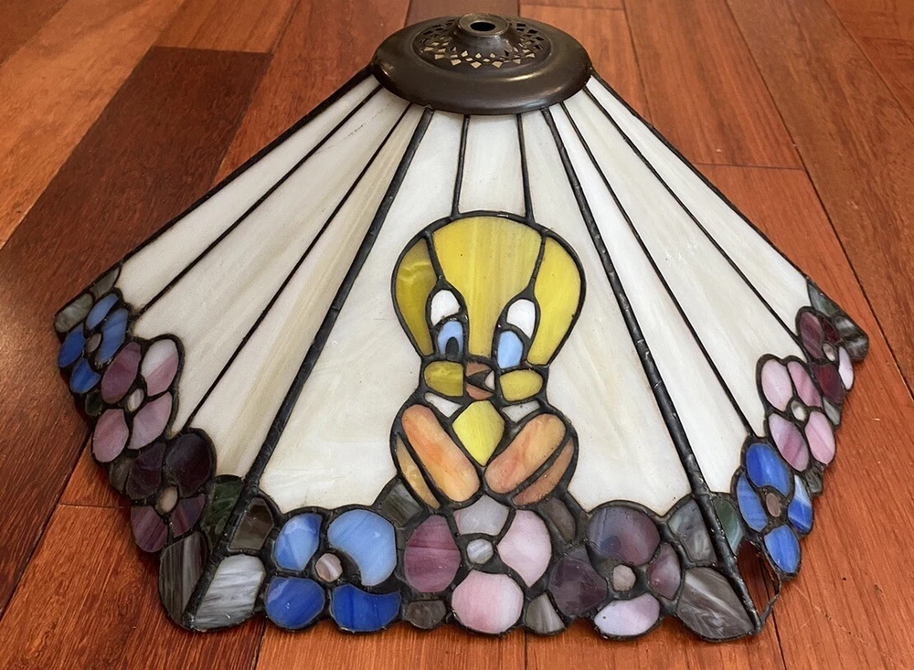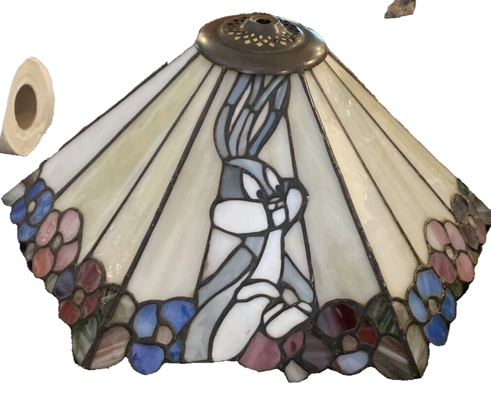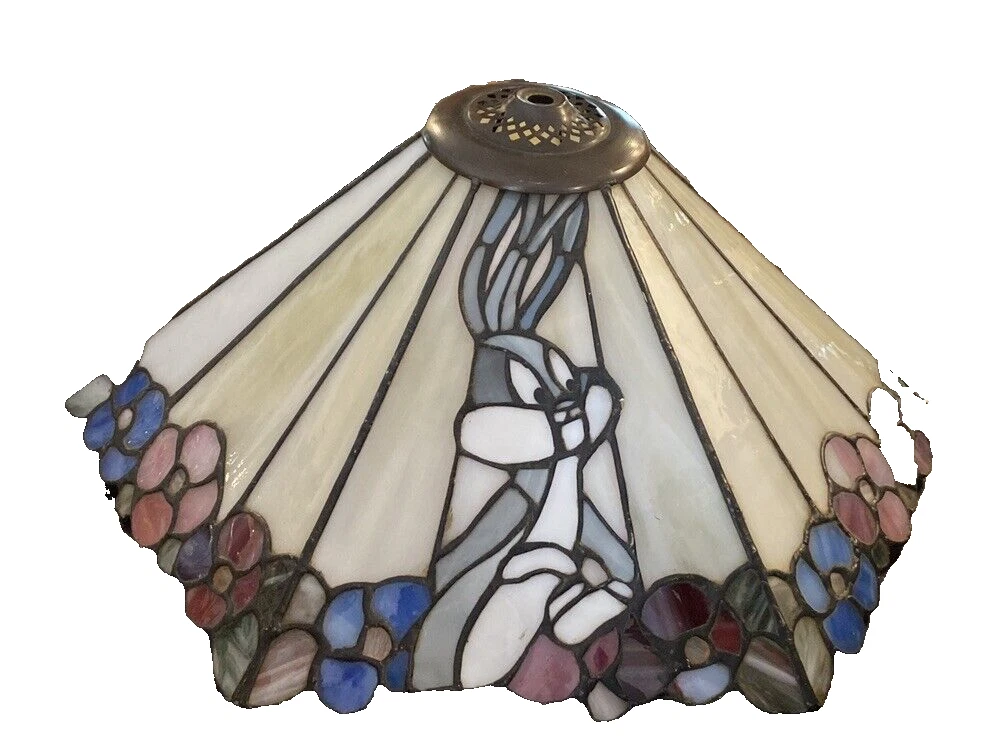 This vintage Dale Tiffany Lamp features Sylvester, Bggs Bunny andTweety from the famous Looney Tunes franchise. The lamp is made of stunning stained glass and is an interactive piece, perfect for any Looney Tunes fan. The lamp is a great addition to any collection and is sure to bring a smile to anyone's face. The shade measures 9" tall and the width across the bottom is 14". This is a very solid piece but please see last 2 pictures. There is a small piece of glass missing at the rim and a crack shown in one of the cream sections