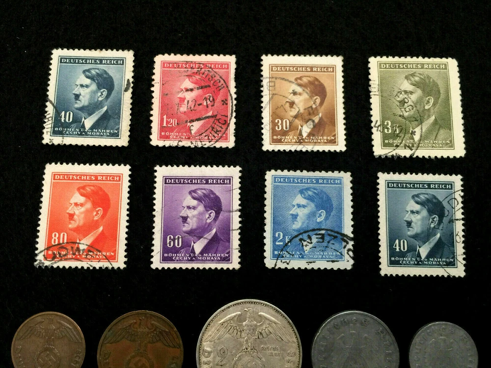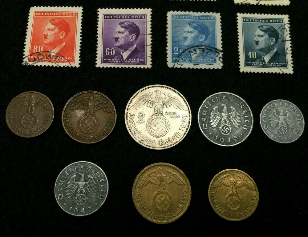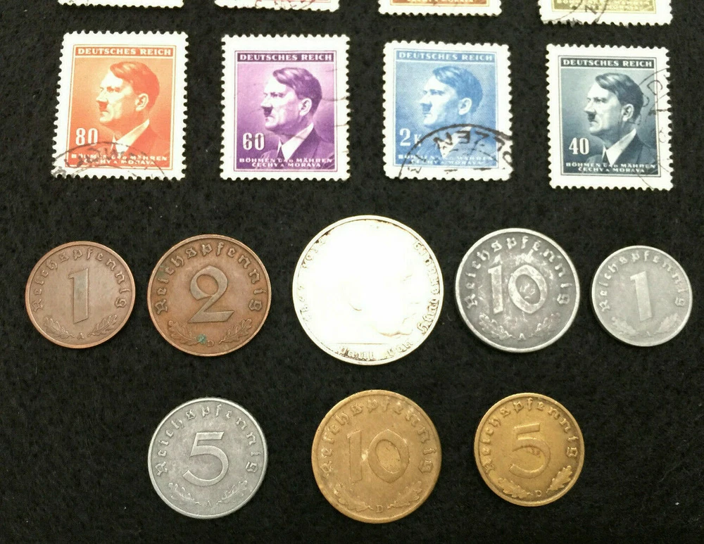 Rare WW2 German Coins & Stamps Set Of Historical Artifacts - Complete Collection You will get all that is shown in the picture : WWII 2 Mark SILVER coin big eagle (1937 - 1939) WWII 1 Reichspfennig bronze coin (1937 - 1939) WWII 2 Reichspfennig bronze coin (1937 - 1940) WWII 1 Reichspfennig zinc coin (1940-1943) WWII 5 Reichspfennig zinc coin (1940-1943) WWII 10 Reichspfennig zinc coin (1940-1943) WWII 5 Reichspfennig brass coin (1937-1940) WWII 10 Reichspfennig brass coin (1937-1940) WWII It will be random pick Circulated stamps with different denomination. WWII 1.20 Pf Circulated stamp WWII 30 Pf Circulated stamp WWII 3 Pf Circulated stamp WWII 80 Pf Circulated stamp WWII 60 Pf Circulated stamp WWII 2 Pf Circulated stamp WWII 40 Pf Circulated stamps Some of the stamps will be different than the picture. These are rare World War 2 historical German coins. These are stock pictures but you will get coins in the similar condition but of different mint mark. These coins were minted in Germany between 1936 and 1944 during World War II, these coins are an emergency issue type. You will receive circulated stamps in the similar condition, the stamps may have postage marks at a different place. Mint Marks A - Berlin, Germany B - Vienna, Austria (Wien) D - Munich, Germany (Munchen) E - Dresden, Germany (Muldenhutten) F - Stuttgart, Germany G - Karlsruhe, Germany J - Hamburg, Germany Imagine holding a piece of history in your hands!!! Note : Stock Photo . Actual coins may vary in terms of year and mint but all in perfect/similar condition. Please let us know if you have any question about this item.