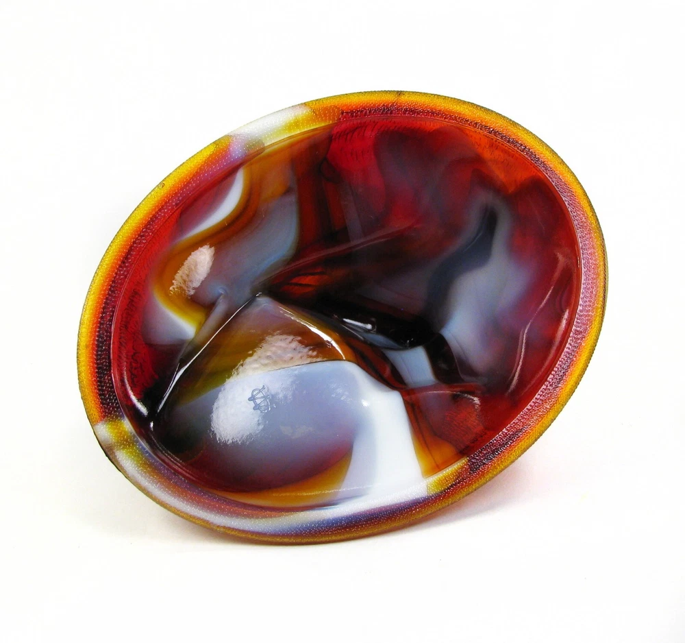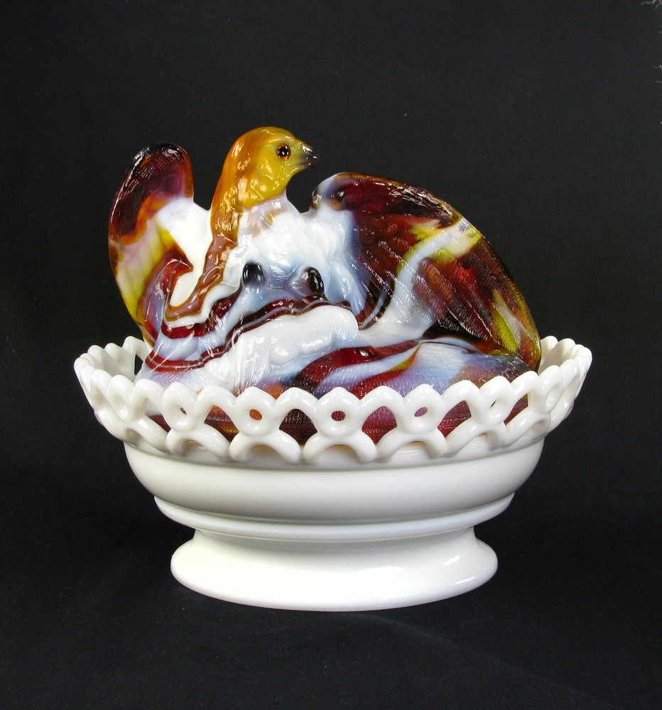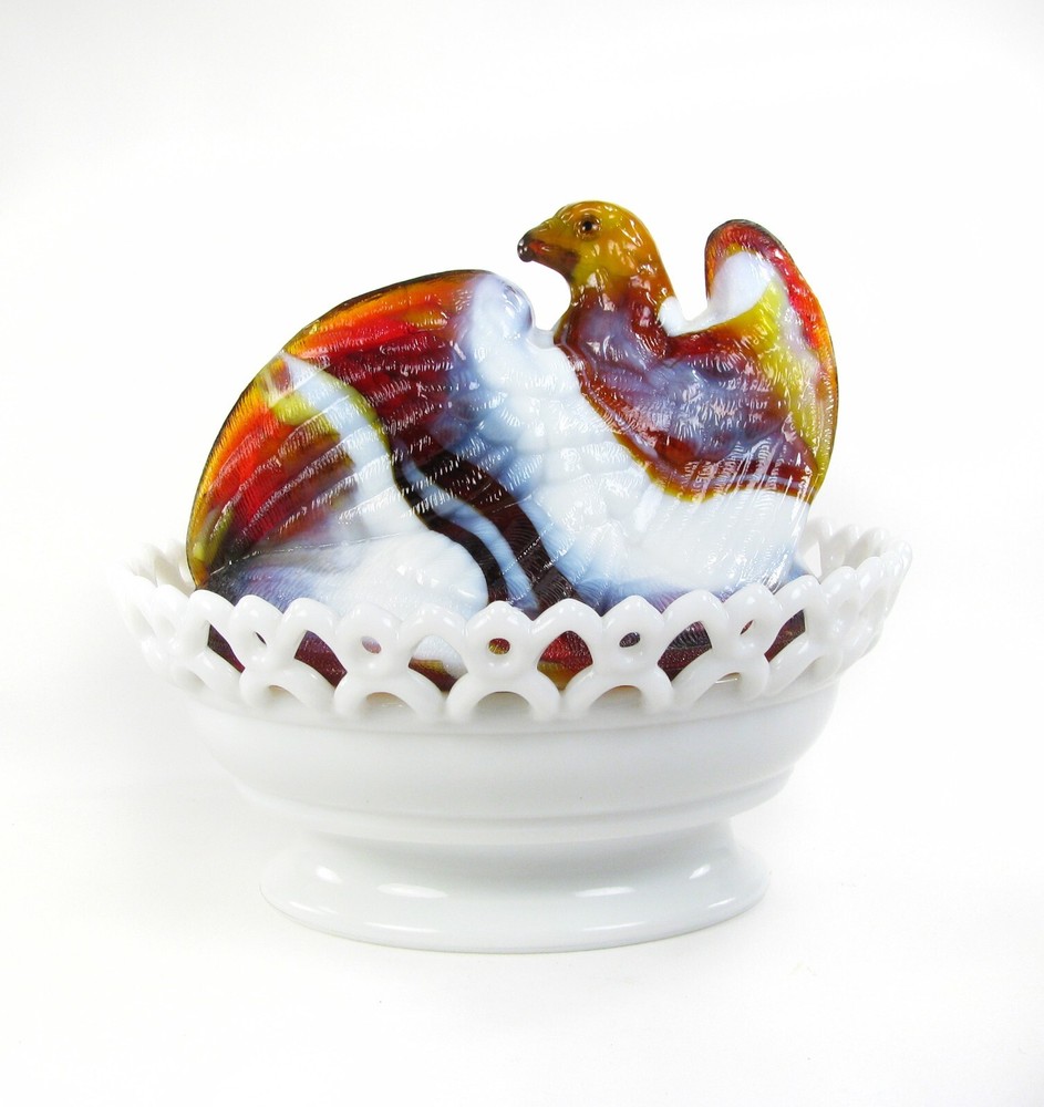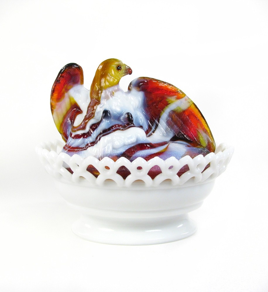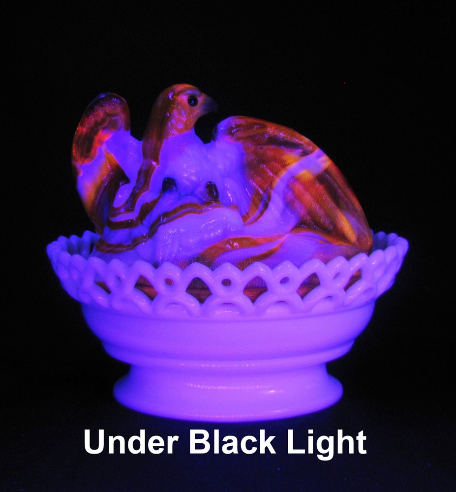 Westmoreland Glass made this red slag or marble eagle top on a milk glass lacy-edge base covered dish - mold number EA-1 . This piece was made in 1982 and was a non-catalog item - these were only sold in the gift shop. It was not uncommon to find red slag animal dish top paired with milk glass bottoms in the gift shop. The base measures about 7.5" across and both the top and bottom are marked with the factory WG logo. No damage found. Note: You are buying one eagle covered dish. The first photo shows the piece under standard LED lighting and the small insert photo shows the same piece under a black light. Black Lights: See photos for black light setup that was used (we use a 395-400nm light). Depending on your type of black light, distance from the light, etc., your color may differ (such as how much purple or red you see under your black light). Some areas of the black light photo may be a reflection from the lights and are not "glow." Combined shipping may not be possible on this item. Inv. #1550