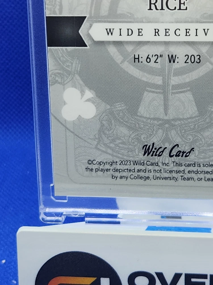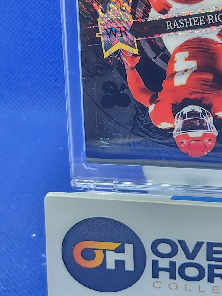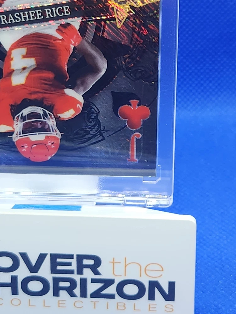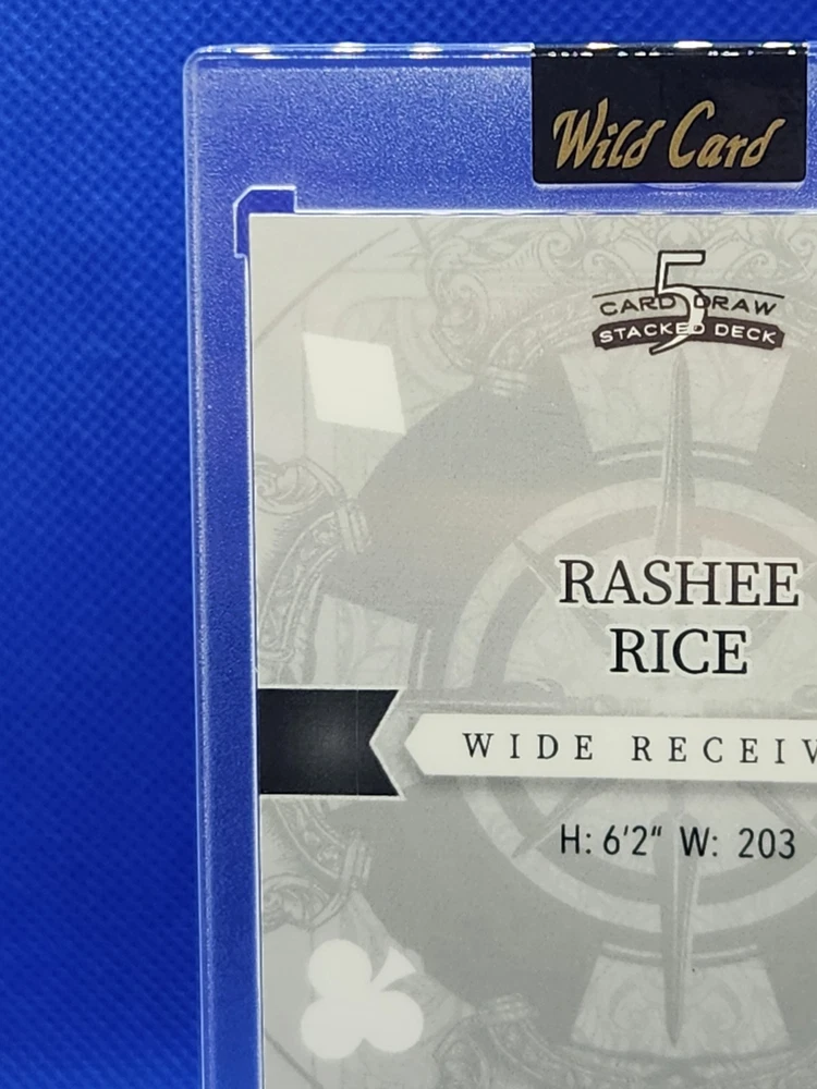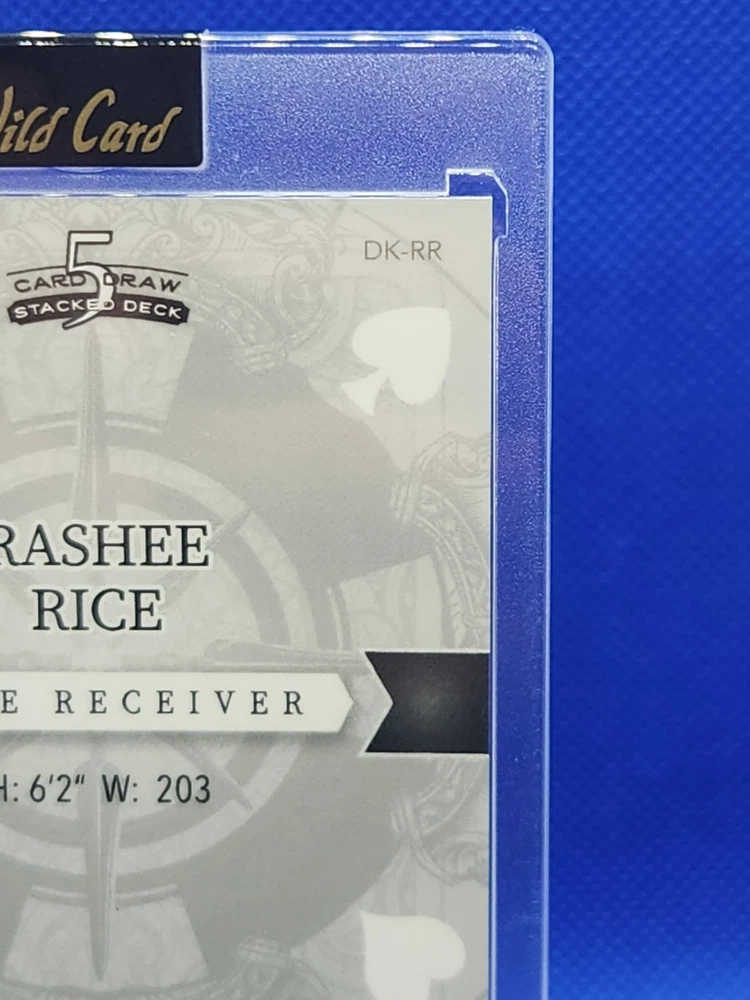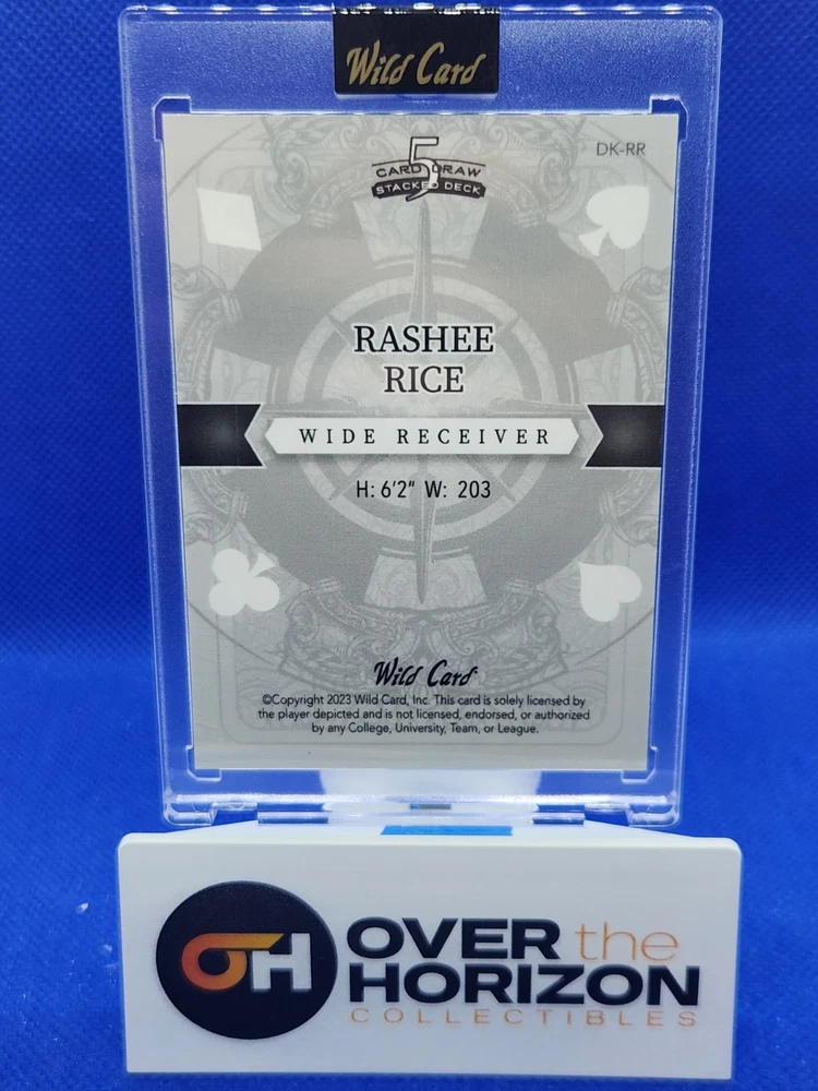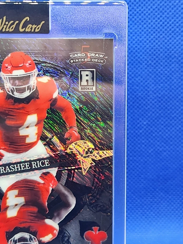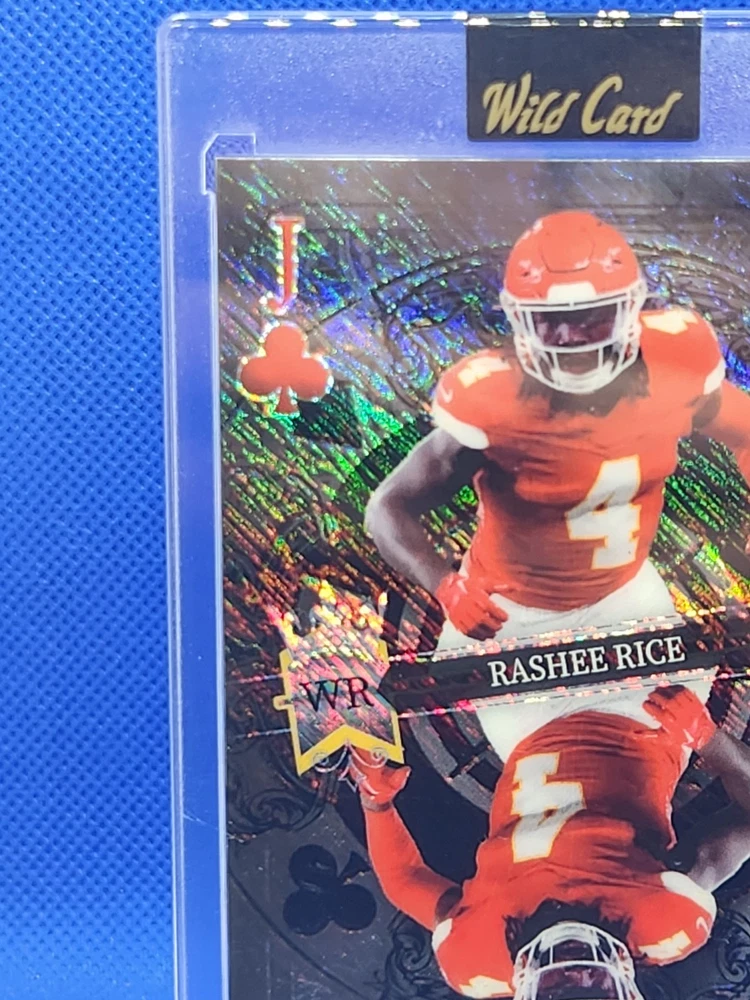 The product is a 2023 Rashee Rice football trading card from Wild Card's 5 Card Draw Stacked Deck series. This 1/1 Black Mirror parallel variety card features a Rookie RC of Rashee Rice, who plays for the Kansas City Chiefs in the NFL. The card is part of a limited edition set and is serial numbered as DK-RR, making it an exclusive collectors' item for fans and collectors of sports trading cards. The card is a unique one-of-one with special features like being a short print and an insert card, adding to its appeal and value in the trading card market.
