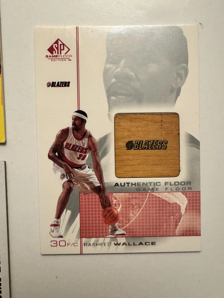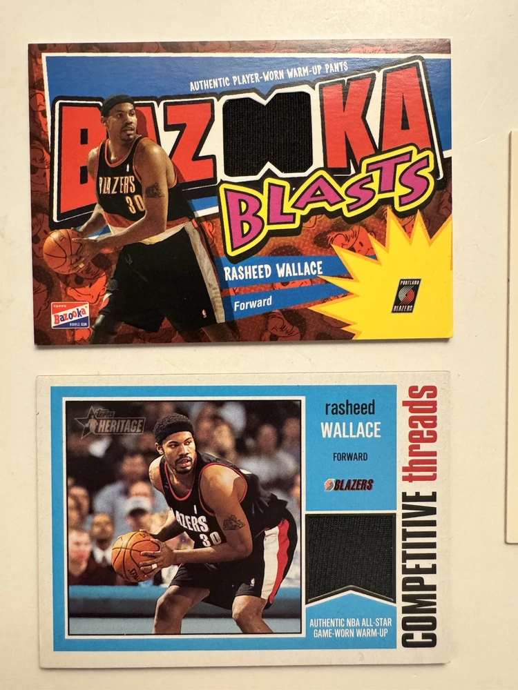 The product is a lot of three Rasheed Wallace patch memorabilia cards from the 2002 Topps Heritage set. These sports trading cards feature Rasheed Wallace, who played for the Portland Trail Blazers and Detroit Pistons in the 2002-03 NBA season. The cards are inserts with chase elements, showcasing memorabilia patches from Wallace's jerseys. Made by Topps, they are a desirable collector's item for basketball fans.