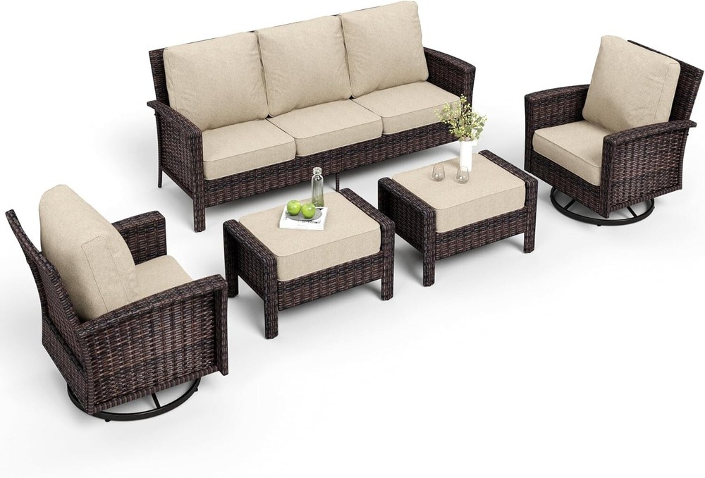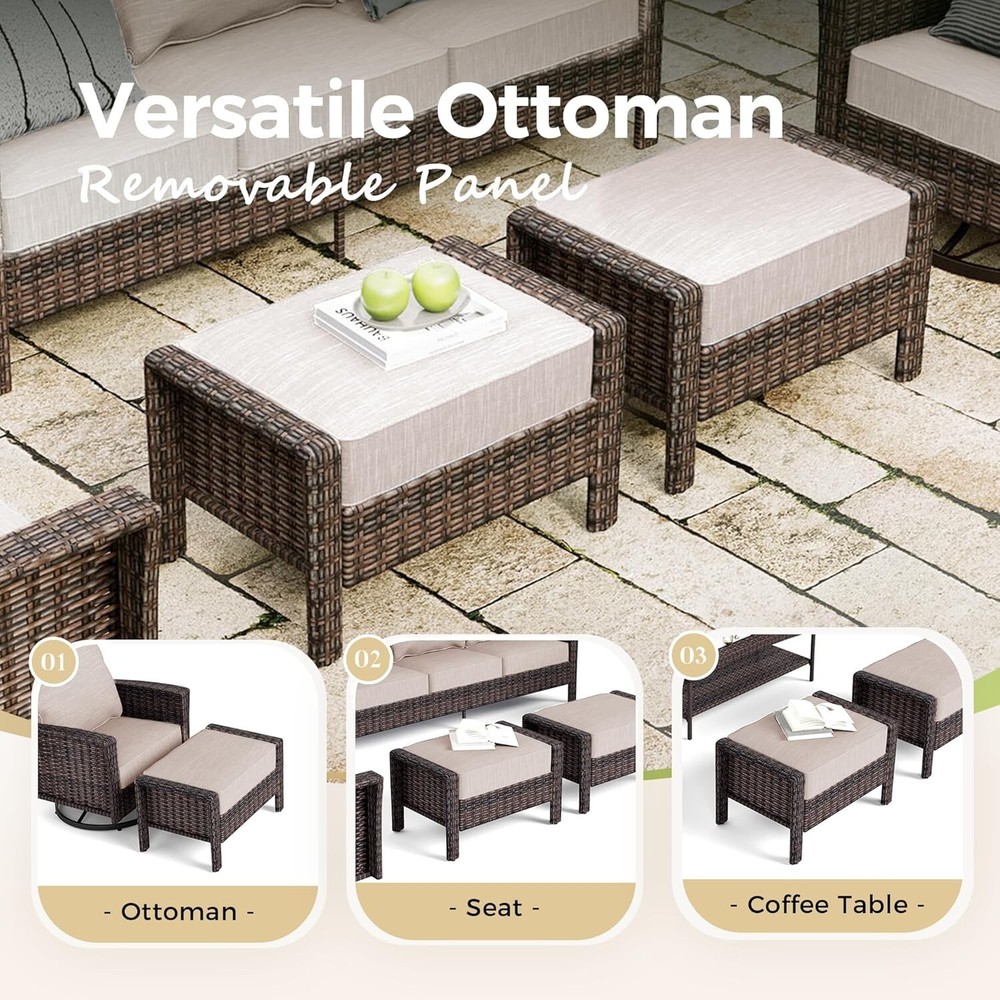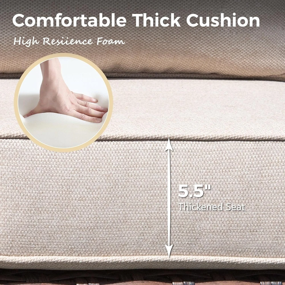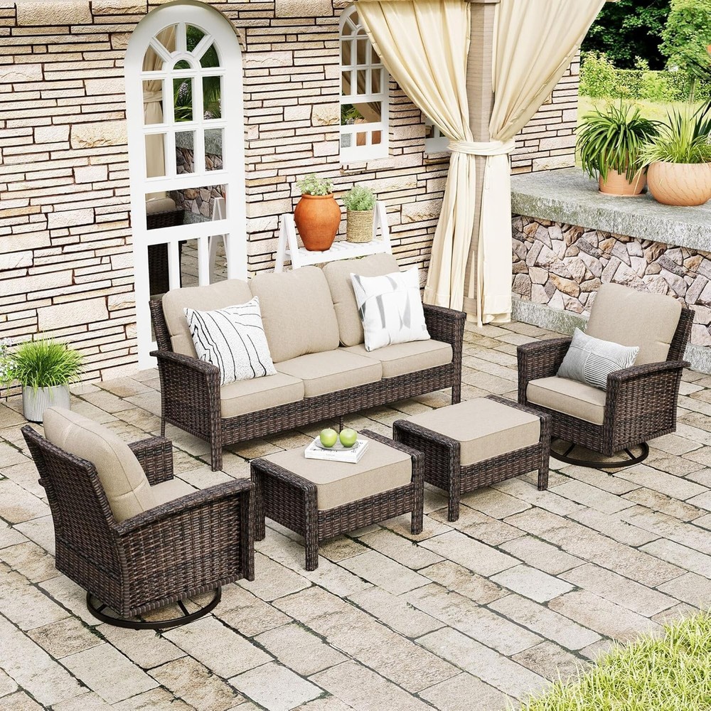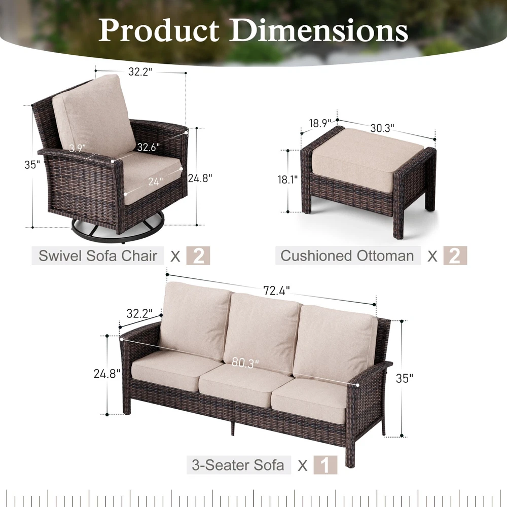 Seating Capacity: Up to 7 For 5: Patio Conversation Set For 3: Patio Furniture Set Model: Rattan Furniture Table Width: 18.9 in Number of Items in Set: Six-Piece Table Height: 18.1 in Chair Back Material: Wicker Year Manufactured: 2025 Brand: PHI VILLA gtin13: Does not apply MPN: Does not apply Cushion Color: Beige Manufacturer Warranty: 1 Year For: Outdoor Furniture Table Shape: Rectangle Table Length: 30.3 in Type: Wicker Furniture Umbrella Included: No Style: Outdoor Furniture Department: Adults, Kids Material: Wicker Features: Unltra Soft, Cushion Included Seat Depth: 24 in For 2: Outdoor Conversation Set Chair Color: Beige Assembly Required: Yes Cushions Included: Yes For 4: Rattan Furniture Set Chair Height: 35 in Chair Width: 32.2 in Assembly Status: Part Assembled UPC: Does not apply Set Includes: Cushions, ottomans, sofa Color: Beige
