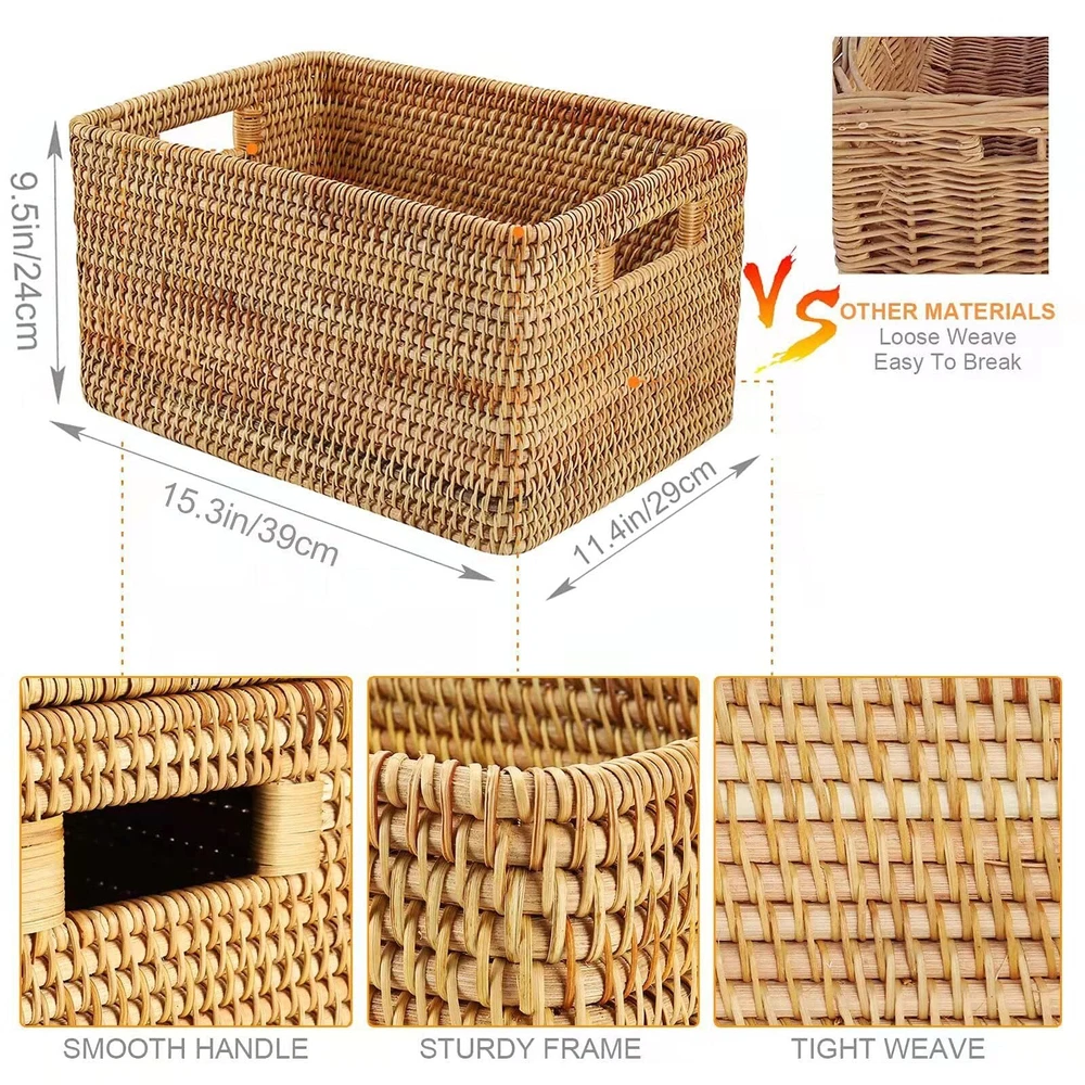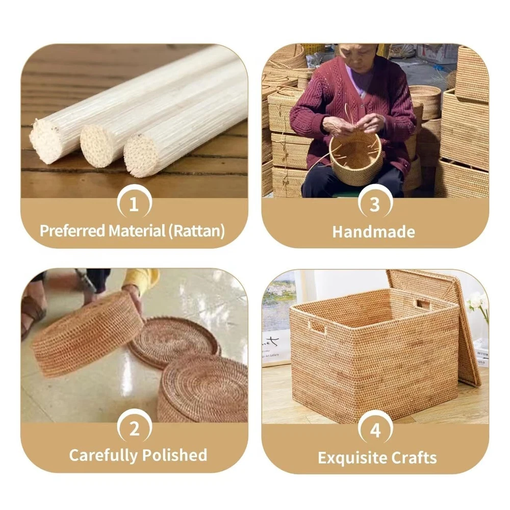 【ORIGINAL RATTAN】:The rattan basket with lid is woven of original rattan instead of plastic imitation rattan.The rattan is more durable and more healthy to your family which can be used last for decades. Reasonable and considerate design is convenient for anyone to use, The elderly and children can easily to move and use. 【DECORATIVE BASKETS FOR HOME DECOR】:All details of every storage box has been carefully processed, the lid can keep the stuff away from dust. The longer you use it, the color of the baskets will gradually darken and become more classical, and the surface will be smoother and more comfortable,the rattan basket is durable and never out of date. 〖HAND-WOVEN〗:The rattan basket is handwoven by vietnamese craftsmen.Because it is handmade, there will be slight errors in size. If there is deformation during use, please wet the rattan with water and use heavy objects to shape and restore. 〖STACKABLE AND WASHABLE〗:Sturdy carrying handles make it easy to carry, and several baskets can be stacked to save storage space. The lid can effectively prevent dust troubles and keep items clean and tidy. Rattan baskets is washable for easy care, just air dry after washing to keep dry. 〖AFTER-SALES SERVICE〗:If you have any questions with the product, please feel free to contact us, we are gald to reply you in 24 hours.
