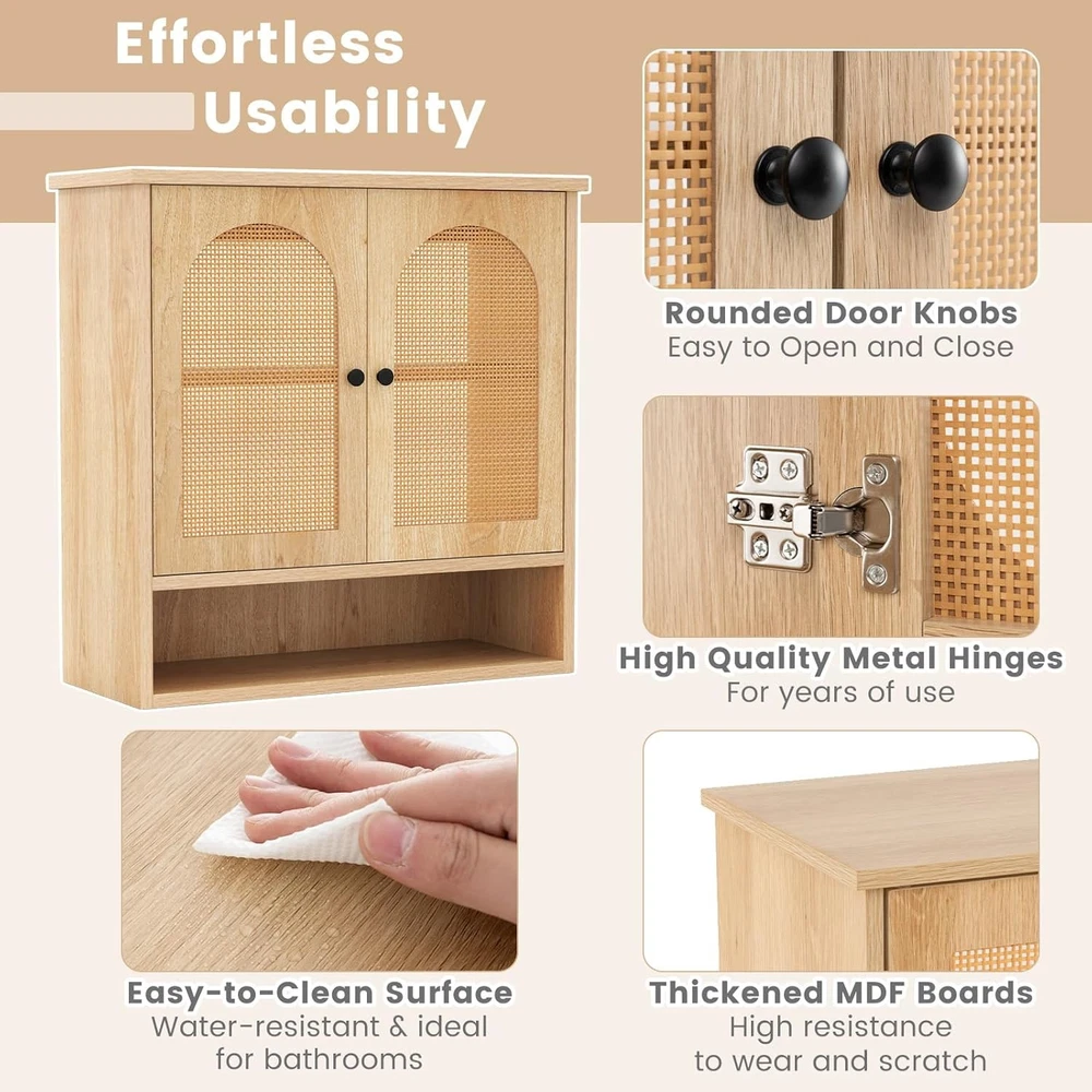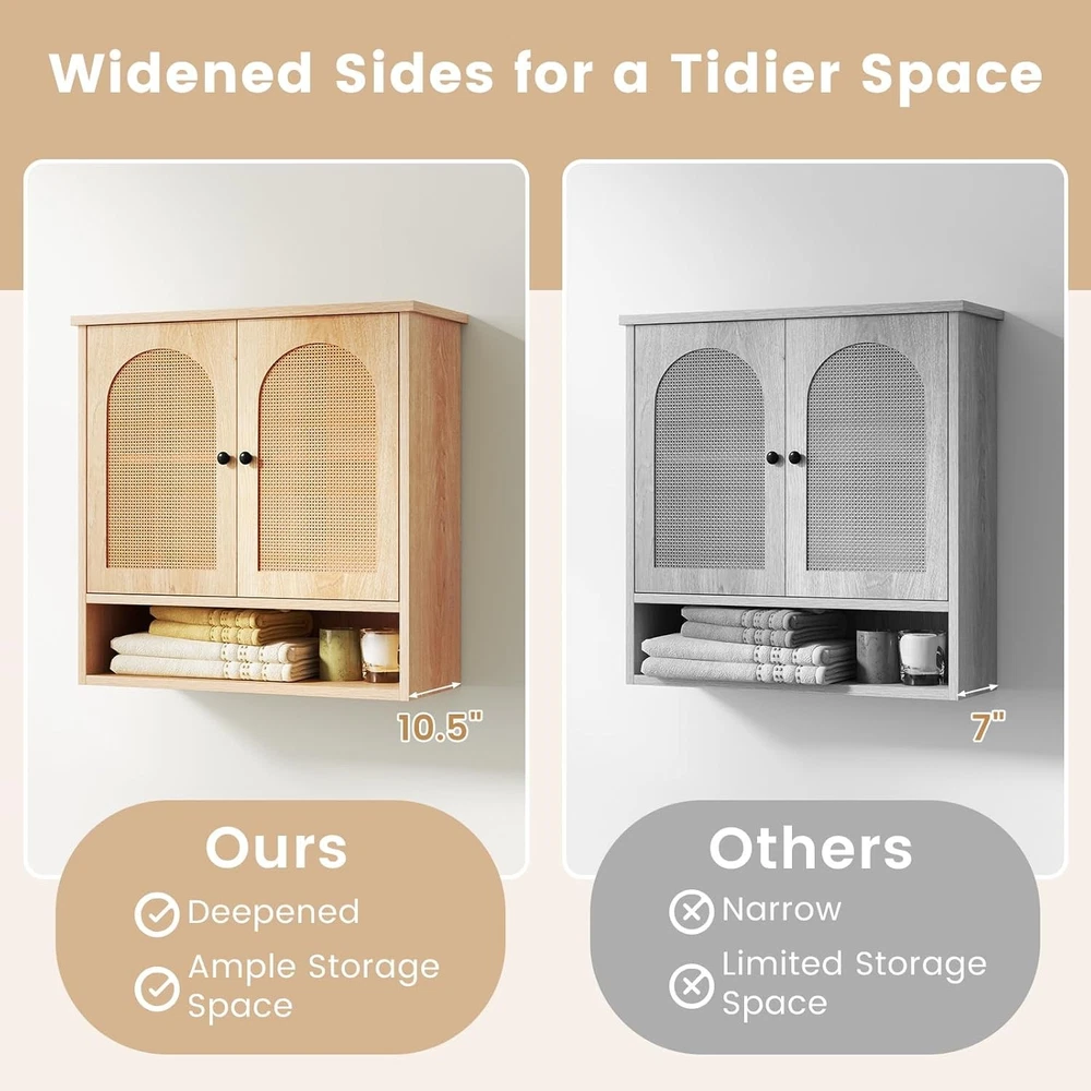 Product Description Description: Our charming wall cabinet features a 2-tier enclosed storage area, a spacious top, and a handy open cube, perfect for stowing away your body wash, towels, shaving gear, and other bathroom must-haves.With its deepened design, an adjustable and removable shelf, and stylish faux rattan doors, the wall cabinet offers a customizable and well-ventilated storage area that keeps your items organized with enhanced aesthetic appeal. Built with quality MDF and easy to upkeep, it is sure to stay stylish for years. Don't wait any longer. Give your home an upgrade today with our chic wall cabinet! Features: 2-tier cabinet for skincare products and laundry supplies Open cube for keeping towels and toiletries handy Spacious top doubles as additional storage space Removable and 3-tier adjustable shelf for various item sizes PP rattan doors for boho chic and better air flow Widened sides for ample storage depth and a tidier space High resistance to wear and scratch with quality MDF Ideal for bathrooms with its water-resistant finish Easy to open and close with rounded door knobs High quality metal hinges for years of use Effortless usability with its easy-to-clean surface Assembly required Specifications: Color: Natural Material: MDF, Engineered Wood, PP, PE, Metal Overall Dimension: 23.5” x 10.5” x 25.5”/60 x 27 x 65 cm (L x W x H) Open Cube Dimension: 22” x 4.5” x 9.5”/55.5 x 11.5 x 24.5 cm (W x H x D) Total Storage Height of Upper Cabinet: 19.5”/49.5 cm Adjustable Height of Shelves: 2.5”/6.5 cm Weight Capacity of Top: 22lbs/10 kg Weight Capacity of Each Tier: 22 lbs/10 kg Net Weight: 22 lbs/10 kg Package Includes: 1 x Bathroom Wall Cabinet 1 x User Guide