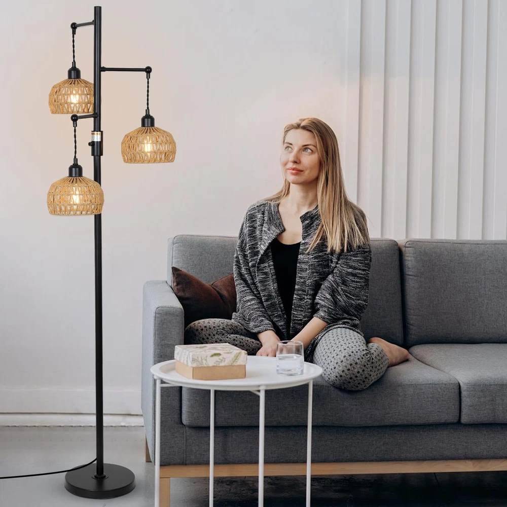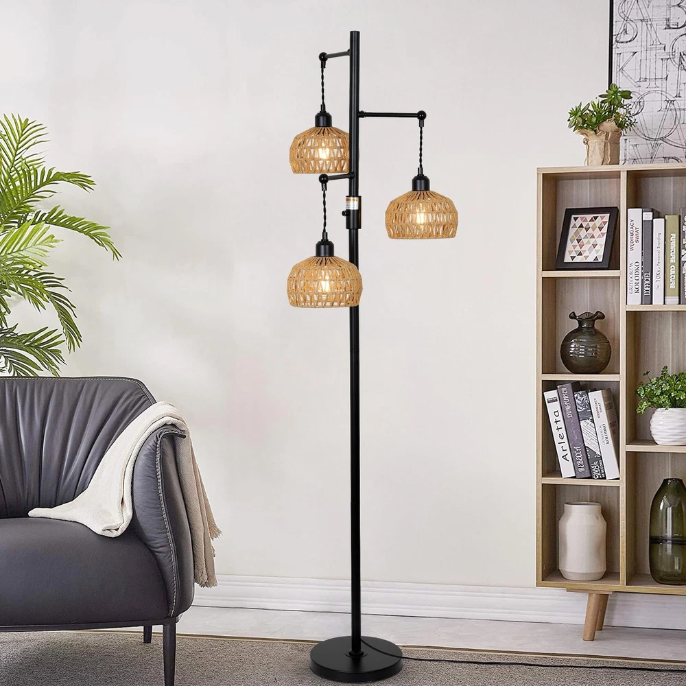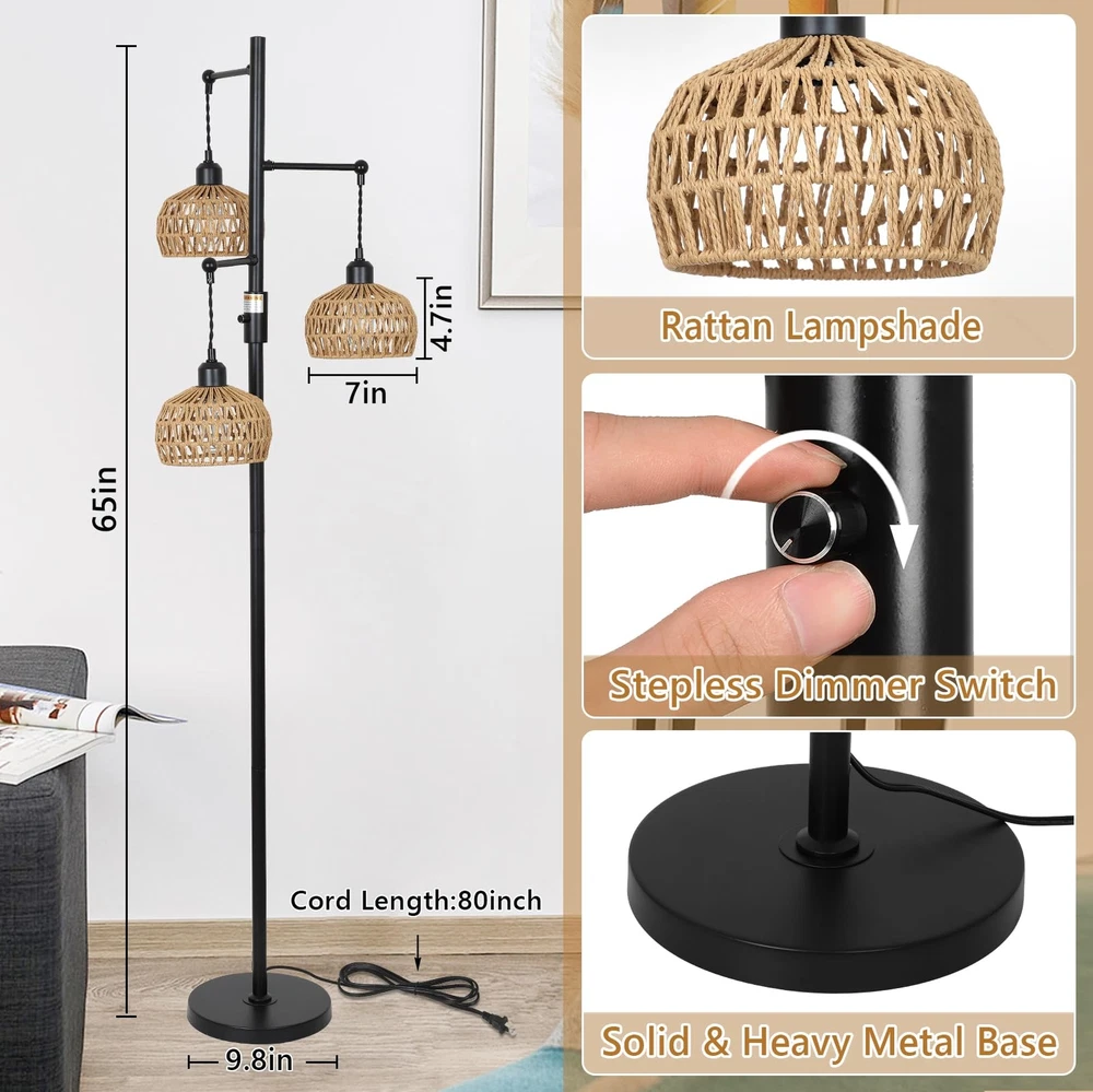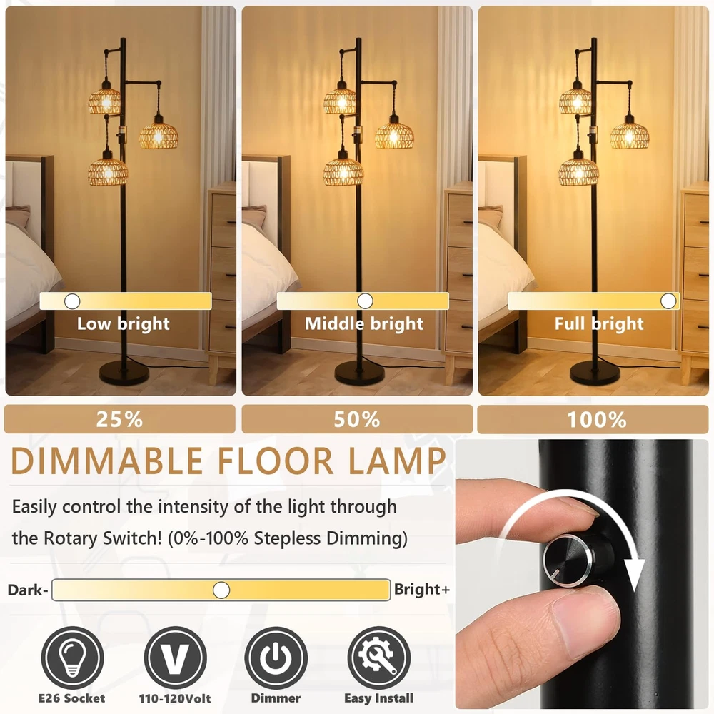 【Upgraded Stepless Dimmable Floor Lamp】Unlike the traditional non-dimmable floor lamps for living room, our boho floor lamp is fully Stepless Dimmable. Just simply twist the dimmer and then you can adjust the rattan floor lamp in the brightness range of 0 to 100% according to the needs of different scenes. Match for any indoor areas which including Living Room, Bedrooms, Dining room, Nursery, Office, Corridor, Basement, Sofa Corner and Reading Room. 【Natural Rattan Shade & Reinforced Base】This farmhouse floor lamp comes with 3 hand-woven rattan lampshades: Natural, Good light transmission and Soft light. Reinforced metal base: Made of non-slip material to ensure that it is stable enough and resistant to tip over, ensuring the safety of your home. Whether you install this rustic bohemian floor lamp in any room of home, you will be immersed in the warmth of the light and the wonderful ambience to enjoy! 【E26 UL Socket & Easy Installation】This 65inch rustic floor lamp is equipped with 3 E26 UL sockets, compatible with led, cfl, incandescent, tungsten and halogen bulbs (Bulbs Are Not Included, Max 40W, Dimmable Bulbs Only). We will provide you with detailed instructions and all the parts, so this floor lamp for bedroom can be easily assembled without any tools, you just need to follow the instructions to screw all the parts together. 【Ideal Choice & Safety Promise】3-Light design of this vintage floor lamp will bring a strong enough light to your home in all directions. All sockets, wires and switch of this farmhouse floor lamps for living room has passed UL certification, safe and reliable. 89inch long cable allows you to move this black floor lamp indoors at will. This unique floor lamp is ieal for your friends or family as a Christmas, birthday, housewarming, holiday suprise. 【24 Months Professional Service】√has been deeply involved in the lighting industry for more than 10 years and has a professional after-sales team. √We promise to provide you with 24-month parts replacement service. √If you have any questions about the tall tree floor lamp, we will provide you with professional services.