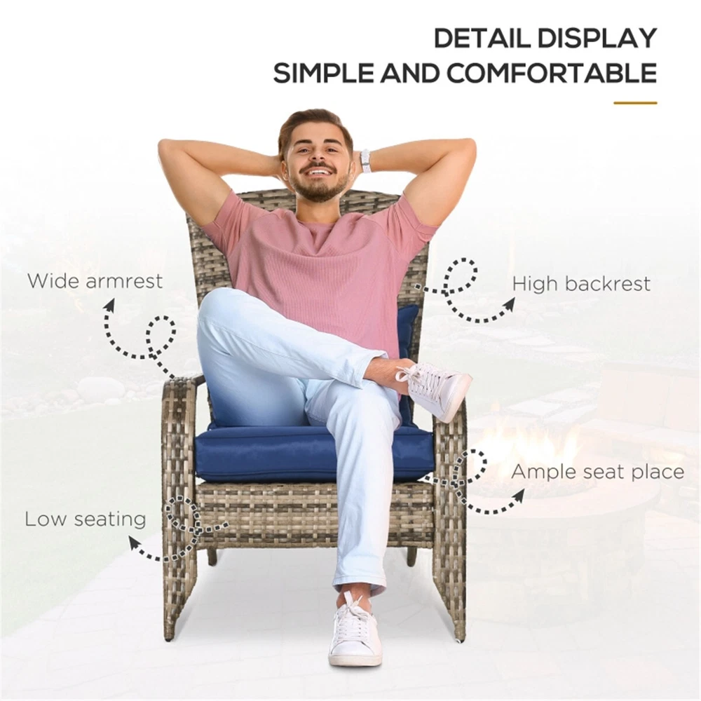 Features: - Made with a water-safe steel frame, wrapped with hand-woven PE wicker making it strong enough to withstand almost all weather conditions - Tall and curved backrest, wide armrests, and ample seat space designed for dozing - The wide arms are great for balancing drinks or small items or give you some extra leverage in getting up - Soft padded foam and back support provide a comfortable seating experience - Cushion covers with zipper are easy to remove and clean - Ideal for placement on the porch, patio, or by the pool - Assembly required Specification: - Color: Mixed Tan Wicker, Dark Blue Fabric - Materials: Steel, PE Rattan Wicker, Polyester - Overall Dimensions: 25.19" W x 31.5" D x 35.43" H - Seat Dimensions: 19.75" W x 19.25" D x 12.5" H - Backrest Dimensions: 21.25" L x 19" W - Weight Capacity: 352 lbs. Package Includes: - 1 x Rattan Adirondack Chair - 1 x Cushion