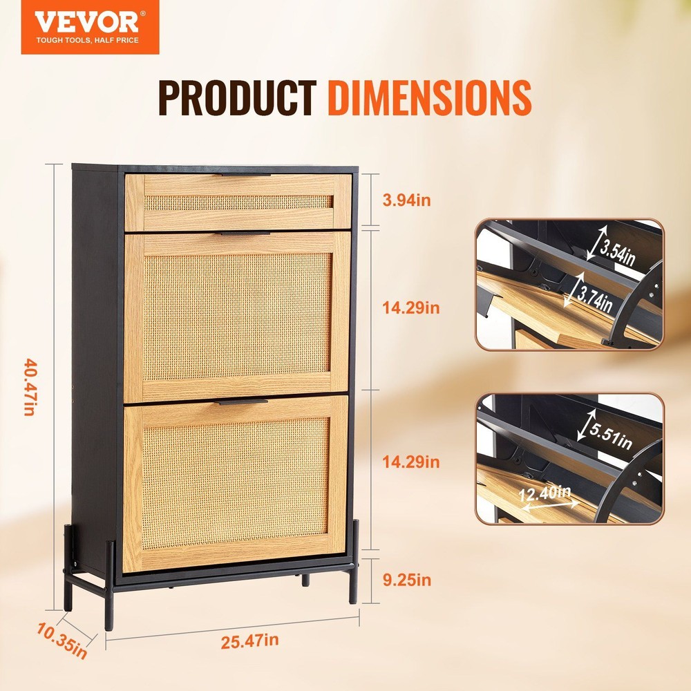 Transform your entryway with VEVOR multifunctional rattan shoe cabinet! Featuring an innovative space-saving design, this rattan shoe cabinet allows you to easily access your favorite shoes while neatly hiding them away when not in use, keeping your entryway tidy. The intelligent layered design creates a perfect system for managing your shoes. Each pair has its own dedicated space, making it easy to organize and quickly find the shoes you want to wear in this rattan shoe storage cabinet. This multifunctional design meets various needs, making it suitable not only for entryways and hallways but also for closets and dressing rooms. Using the shoe cabinet as versatile furniture enhances overall home harmony and aesthetic appeal. With its classic rattan finish, metal supporting legs, and aluminum alloy handles, this rattan shoe rack is simple yet stylish, seamlessly blending with various home decor styles to achieve a coordinated and beautiful look. Crafted from high-quality materials, the side panels and tabletop thickness have been reinforced to 15mm, ensuring the durability and wear resistance of this shoe storage entryway cabinet, designed to withstand everyday use.