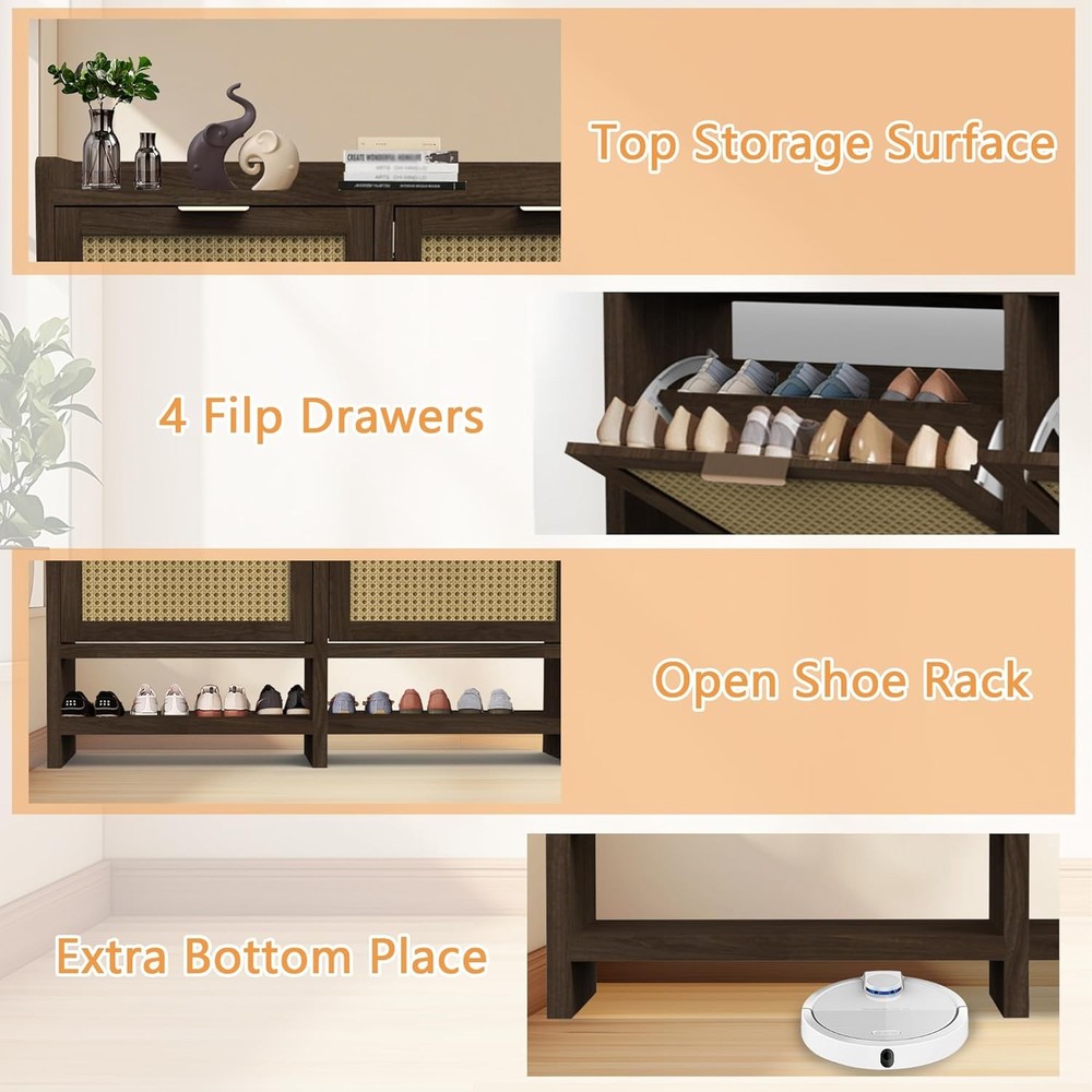 Shoe Cabinets with 4 Rattan Flip Drawers and Extra Storage Shelf, Freestanding Narrow Shoe Organizer Rack for Entryway, Brown Oak Product Description About this item 【Boho Shoe Cabinet】The shoe cabinets with 4 ratten flip drawers, wooden frame and smooth handles which enhance the mid-century design of the entry way. This stylish and rustic shoe dresser is suitable for hallway, living room, or porch. 【Drawers and Extra Shelves】Our entryway cabinet with four fliped drawers and extra shelves provide large storage space to meet your shoe storage needs. Each drawer contains 2 layers of storage space and can be easily taken and divided into shoe sections. The panel can be adjusted or removed. 【Solid and Premium】Crafted with durable MDF wood for long term use, this four drawer narrow shoe cabinet with a strong structure and great weight capacity to hold your shoes. We also provide thick legs and anti-tipping device to prevent hazards. 【Space Saving】This slim shoe cabinet top is scratch-resistant, waterproof, and easy to clean, offers ample storage for picture frames, keys, wallets. This hidden shoe storage bottom space is ideal for storing slippers. It is an unique gift for him her dad kids. 【Easy to Assemble】All necessary accessories are included with our detailed instructions, precise holes and coded parts, you can easily create this entrance shoe cabinet. If there any problem, please contact us for a replacement or a solution for you. Thickened Board Metal Handle Rattan Door Wood Frame Sturdy Base Anti-tipping Device Adjustable Drawer Anti-Drop Shield Fliped Drawer for Daily Use Extra Shelves for Common Shoes