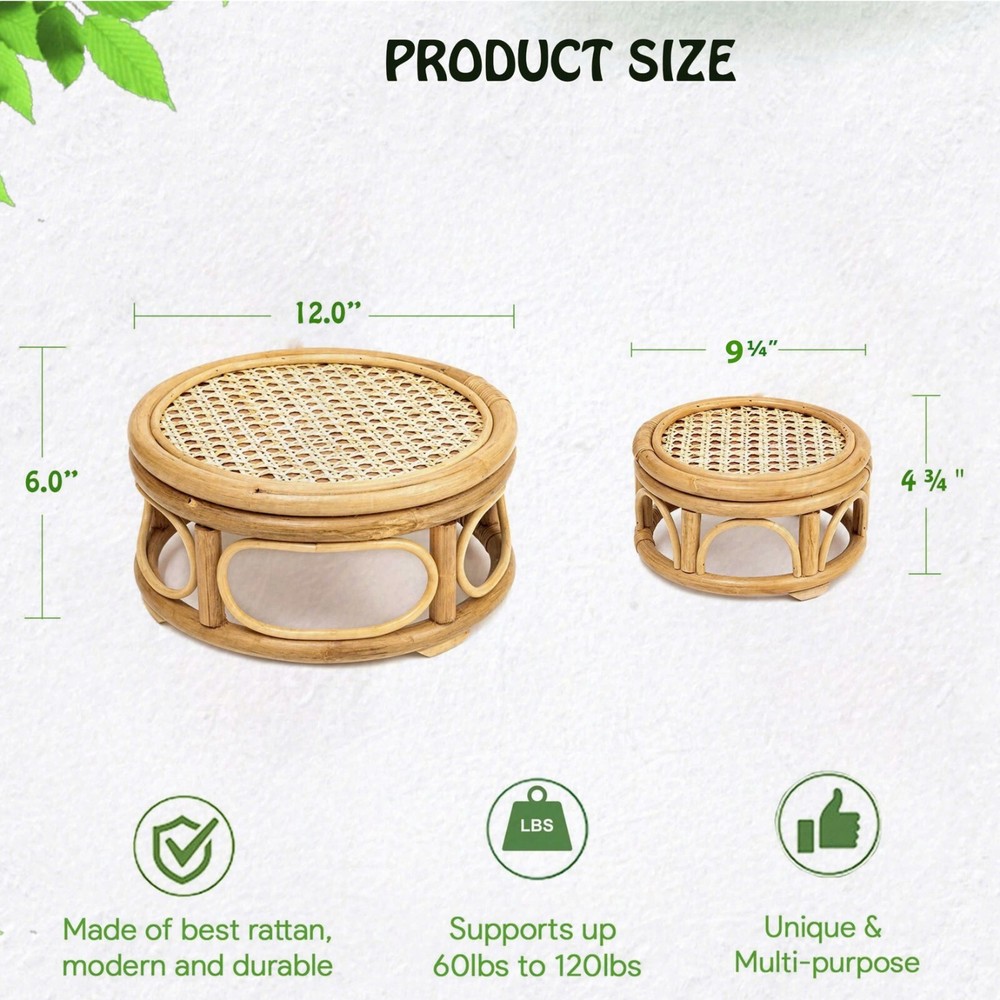 Large Rattan Wicker Round Risers Decorative Indoor Plant Stand, Rustic Farmhouse Natural Small Wooden Circle Pedestal For Decor & Display, Boho Home Decor, Set of 2 🎯 【VERSATILE DESIGN】: Natural rattan round riser perfect for displaying plants, decor items, or as a decorative accent piece in any room. Boho plant stand with a stand-by Kutorkill will be a great addition to any lovely homes especially to all the plant lover out there. 🎯 【HANDCRAFTED DETAILS】: Rattan plant stand is made of high quality natural rattan - can allow for a weight up 60lbs (Small) to 120 lbs (Large). Beautiful woven cane pattern seat and sturdy rattan frame create an elegant bohemian aesthetic. 🎯 【COMPACT SIZE】: The small size rattan stool display stand is: 9½" × 4¾", and the large size of our stand is: 12.0" × 6.0". Perfect tabletop size for small spaces, featuring an elevated design that adds height to displayed items. 🎯 【RUSTIC CHARM】: The indoor plant stand is made of natural rattan with a coat designed in a novel, impressive, unique, and completely different way from previous models of plant stand. Boho plant stands is completely handmade by experienced artisans.