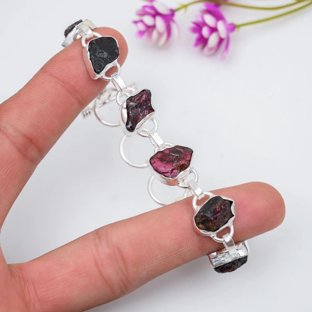 Raw Garnet Gemstone Jewelry 925 Sterling Silver Handmade Chain Bracelet For Gift