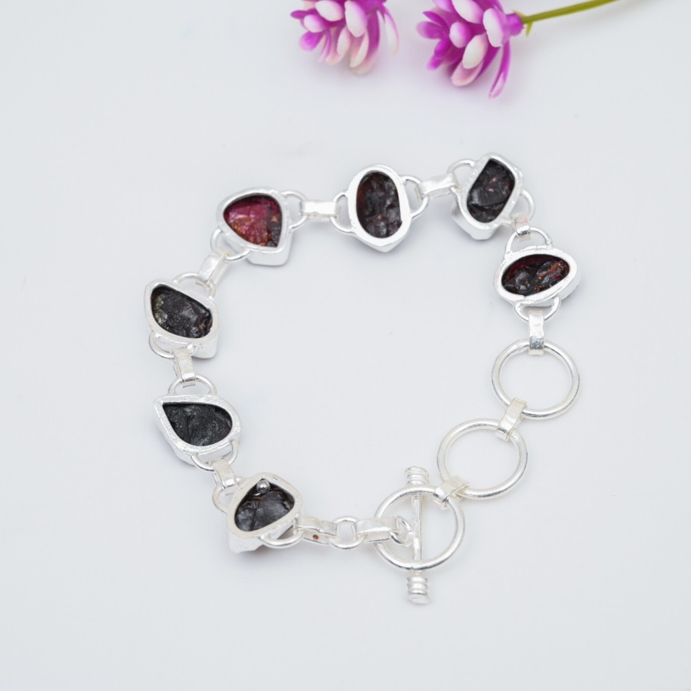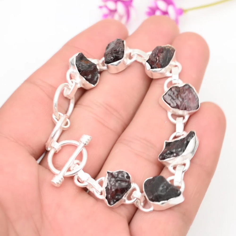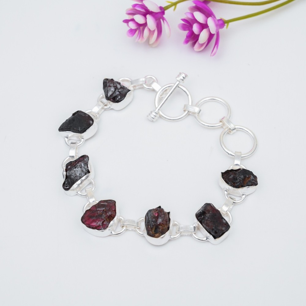Colored Diamond Intensity:N/ABrand:HandmadeCertification:N/ADiamond Color Grade:N/ATheme:Beauty, Bohemian, Ethnic, Halloween, LoveColor:SilverSecondary Stone:Raw GarnetMetal:Sterling SilverCollection:HandmadeMain Stone Depth:N/ATotal Carat Weight:10 carat and aboveMain Stone Width:N/AMain Stone Creation:NaturalFeatures:AdjustableDiamond Clarity Grade:N/AClosure:ToggleNumber of Diamonds:N/ANumber of Gemstones:7Setting Style:BezelMaterial:GemstoneMain Stone Shape:Same As PictureShape:Same As PictureChain Type:N/AItem Length:8 inches with Adjustable ChainMaterials sourced from:IndiaCharm Type:Same As PictureCountry of Origin:IndiaCut Grade:ExcellentMain Stone Color:RedMain Stone Length:N/ABase Metal:Sterling SilverStyle:ChainMetal Purity:925Occasion:Anniversary, Birthday, Christmas, Engagement, Mother's Day, Valentine's Day, WeddingType:BraceletMain Stone:Raw GarnetMain Stone Treatment:Not Enhanced