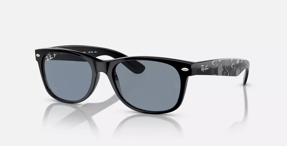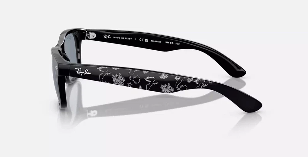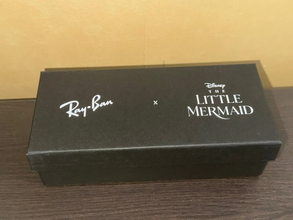 The product is a limited edition collaboration between The Little Mermaid and Ray-Ban. It is a pair of stylish black square sunglasses with polarized blue lenses. The frame is made of plastic, featuring a classic design. These sunglasses are specifically designed for women and would be a fashionable accessory for any outfit. These are from Disneyland Anaheim and are brand new never opened