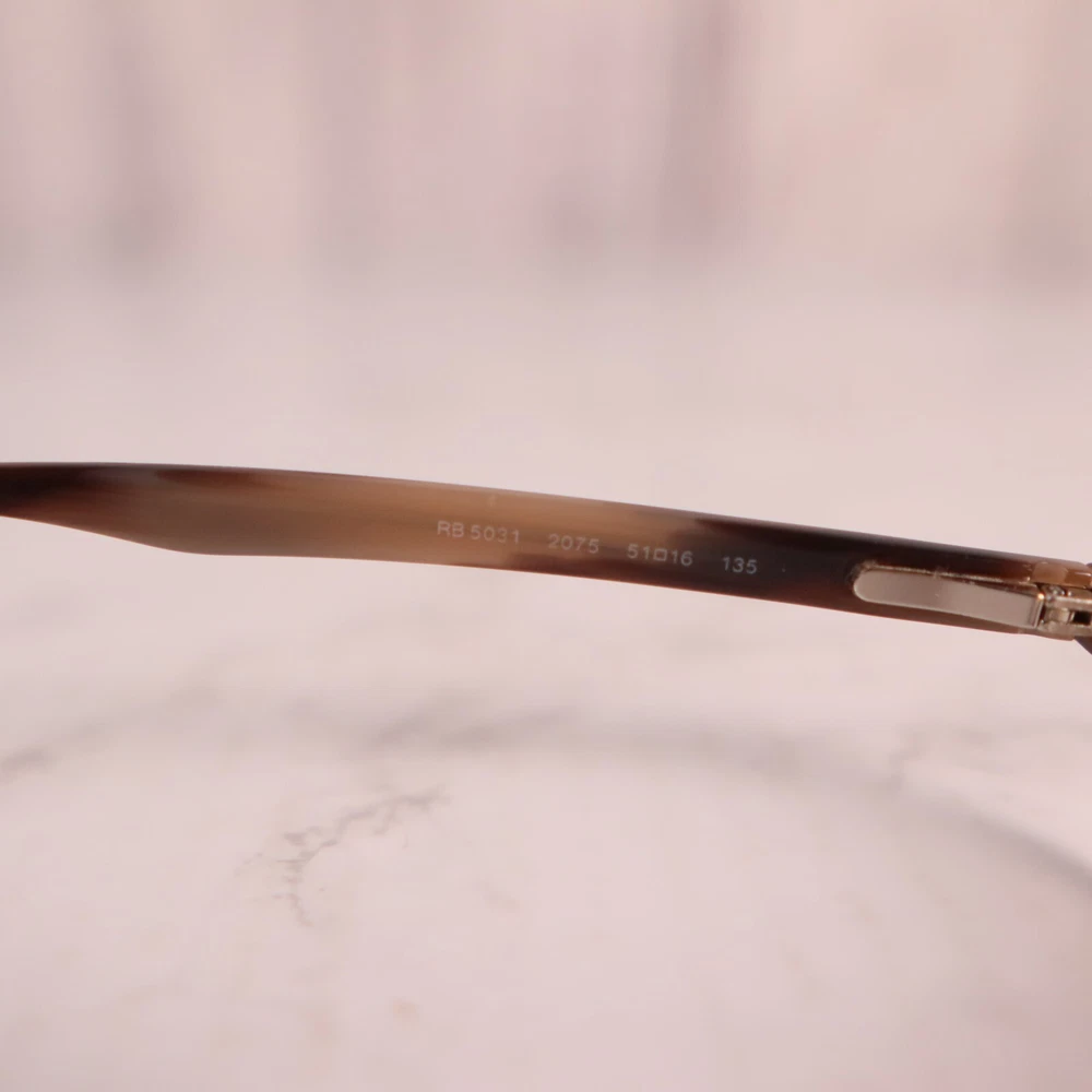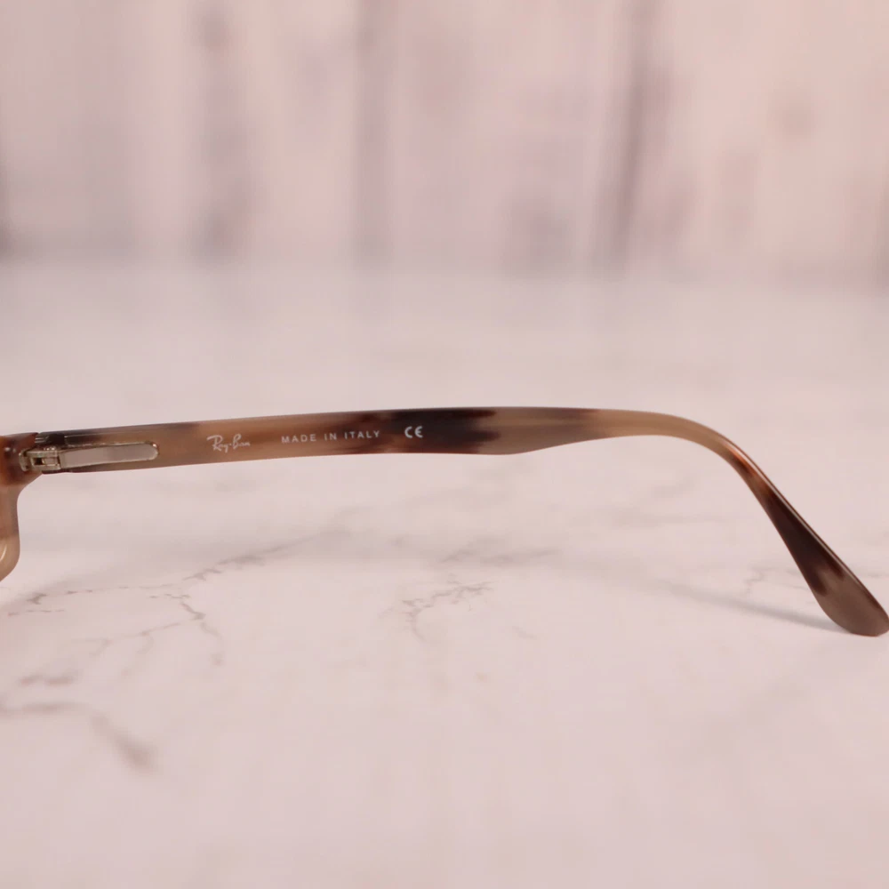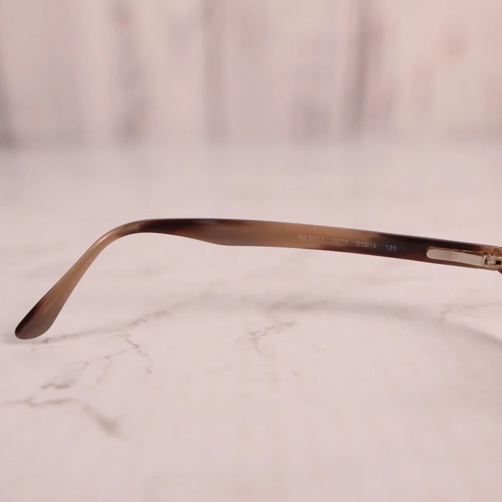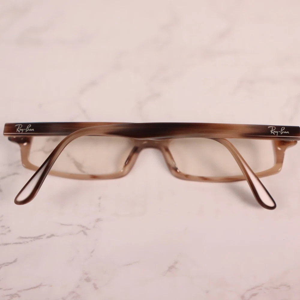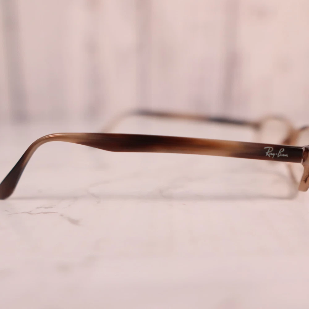 UPC: Does not apply Features: Full Rim, Rectangular Bridge Width: 16 mm Model: Ray-Ban RB 5031 Type: Eyeglasses Temple Length: 140 mm Brand: Ray-Ban Pattern: Striped Lens Socket Width: 53 mm Style: Full Rim Seller Notes: “Frame only, the lens are scuffed/scratched and will need replaced” Department: Women gtin13: Does not apply Frame Color: Brown MPN: Does Not Apply