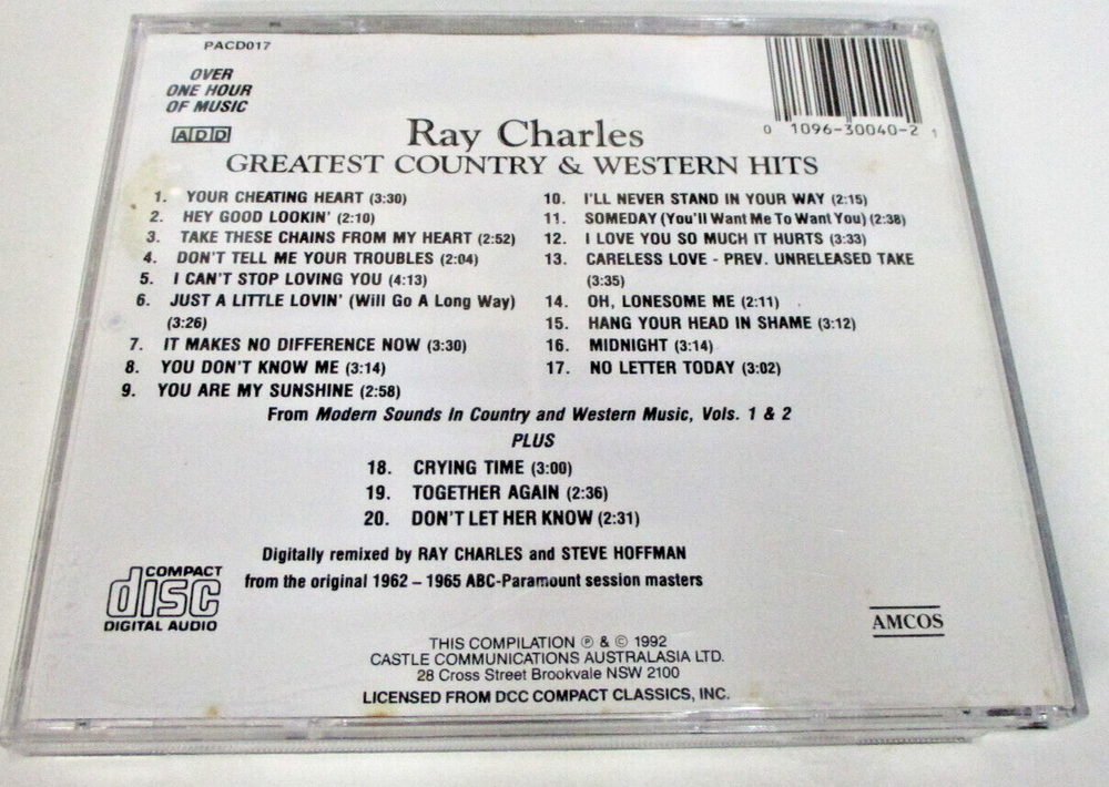 CD Details: Greatest Country and Western Hits Ray Charles Song Titles - see photo CD is good CD insert is good Crystal case is ok, moderate wear, crack in front, hinge is broken Buyer to pay postage where indicated. Please contact me prior to bidding if you require further information.