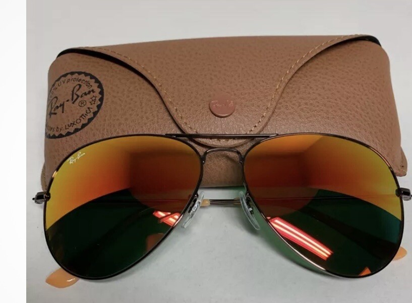 The Ray-Ban Aviator Sunglasses RB3026 feature a stylish bronze metal frame with red/orange flash mirrored glass lenses. With a lens width of 62mm and a temple length of 140mm, these unisex sunglasses offer a classic aviator style that is both modern and colorful. Made in Italy, these sunglasses are designed for outdoor activities and city wear, perfect for individuals looking to add a touch of designer flair to their look. The mirrored lenses provide a unique and trendy touch, making them a standout accessory for those who appreciate quality eyewear. These are both women and men.