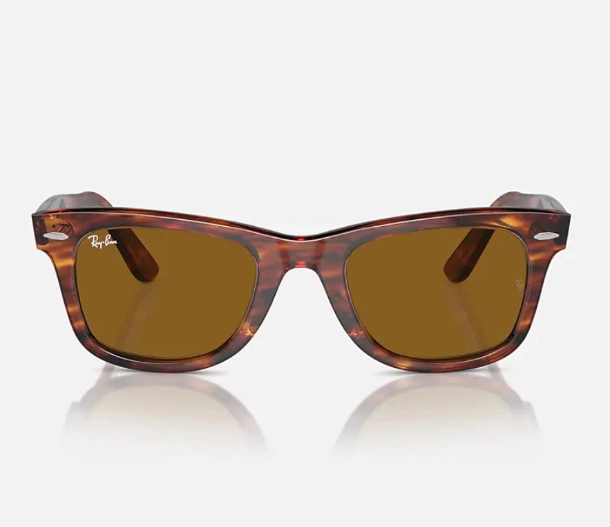 Ray-Ban Original Wayfarer Men's Sunglasses feature a classic design with a Tortoise Shell pattern and Brown frame. The lenses are Gradient and Tinted, providing UVB and UVA protection. The frame is made of Plastic and Acetate, with adjustable temples. The model is RB2140 902/51 in a Square style, suitable for men. The Lens Material options are Glass or Plastic, and the Temple Length is 150 mm.
