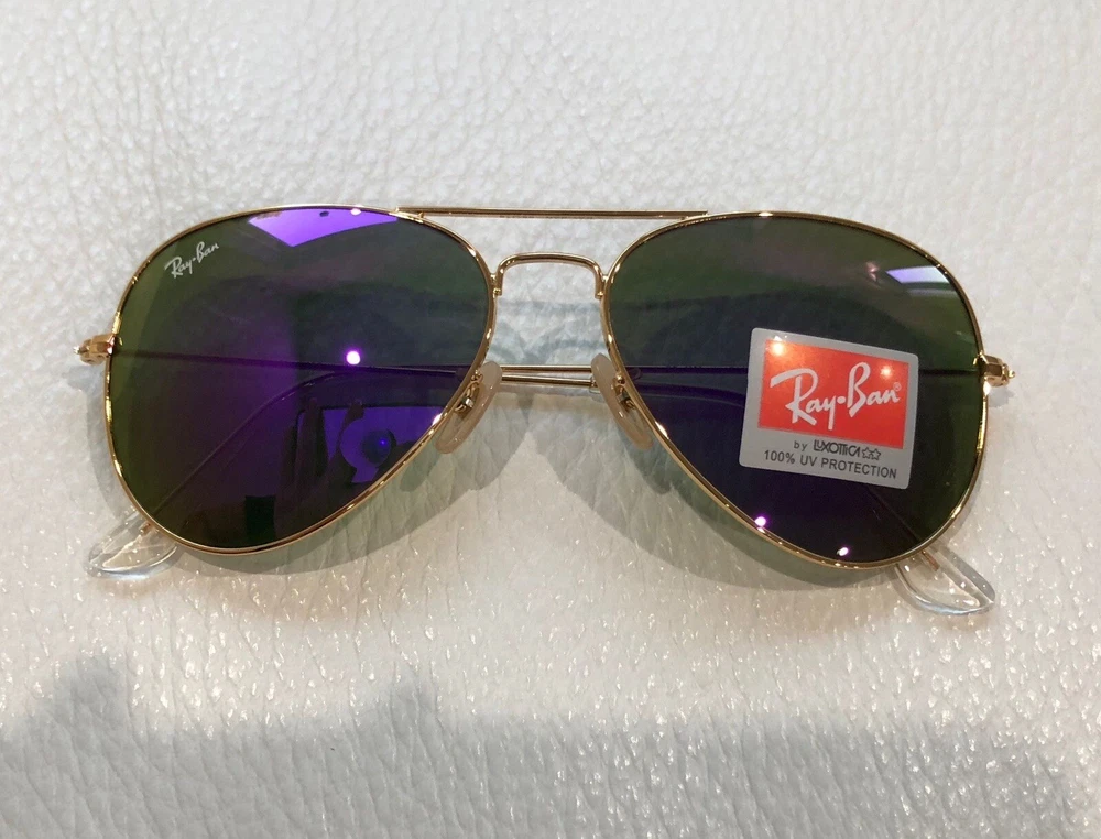 Theme: 80s, 90s, American, Band, Beach, Biker, Classic, Designer, Motorcycle, USA Type: Sunglasses Lens Color: Purple UV Protection: UV400 Frame Color: Gold Lens Material: Mirror Style: Aviator Frame Material: Metal Brand: Ray-Ban Vintage: No Department: Women Temple Length: 135 mm Lens Technology: Mirrored Features: Oversized, Reflective MPN: RB3025 Model: Ray-Ban RB3025 Country/Region of Manufacture: Italy Pattern: Solid Personalized: No