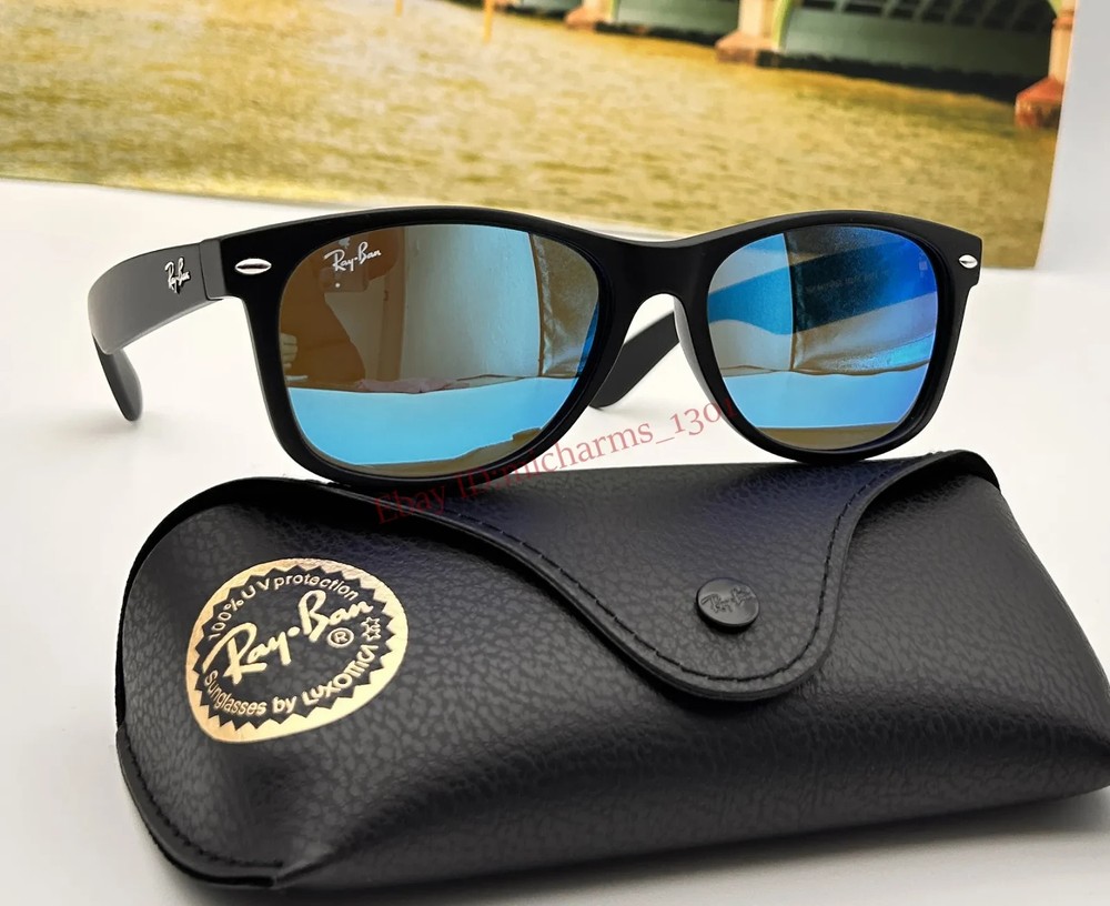 Frame Style Shape: Rectangular/Square Primary Frame Color: Matte Black with Rubberized Finish Material: Lightweight Nylon Temple Arms Color: Solid Black Lens Details Color: Blue Mirror Finish Type: Solid Tint with Reflective Coating Measurements Frame Size: 55mm Lens Width / 18mm Bridge Width Lens Height: Approximately 40.8mm Temple Arm Length: 145mm Fit & Coverage Coverage: Regular / Standard Fit Nose Fit: Designed with a High Bridge What’s Inside the Package One genuine Ray-Ban microfiber cleaning cloth Two original Ray-Ban information leaflets One authentic soft sleeve with Ray-Ban branding One branded Ray-Ban retail box One extra outer shipping carton for added safety during delivery One authentic pair of Ray-Ban sunglasses Product Description Experience a fresh take on a timeless look with the Ray-Ban New Wayfarer Matte Flash RB2132 sunglasses. These bold shades maintain the same flattering silhouette as the New Wayfarer Classic but are enhanced with a vibrant mirrored lens that delivers eye-catching style. Designed for those who want classic comfort with a modern twist.