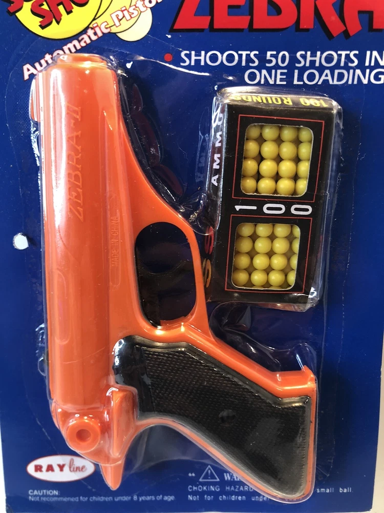 New Orange RayLine Zebra Super Shot Toy Pistol Gun Ammo New on Card Toy is new on card. Punch hole on left side. See photo. Wee bit of price sticker on back. See photo. Few light/small creases on top of card. Typical hanging wear. Inspect photos. Will be shipped boxed. No Returns. Comes from a smoke free home. What you see pictured is the item you’ll receive. Shipping is calculated based on your location by The USPS (Priority or Ground). Check out my other auctions! Thanks and Cheers.