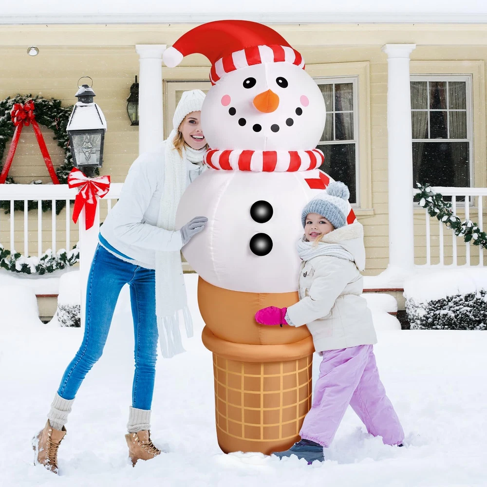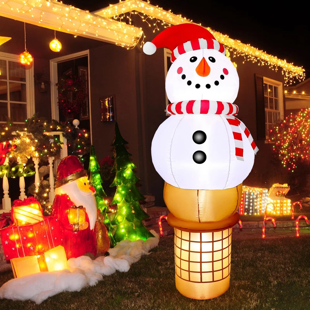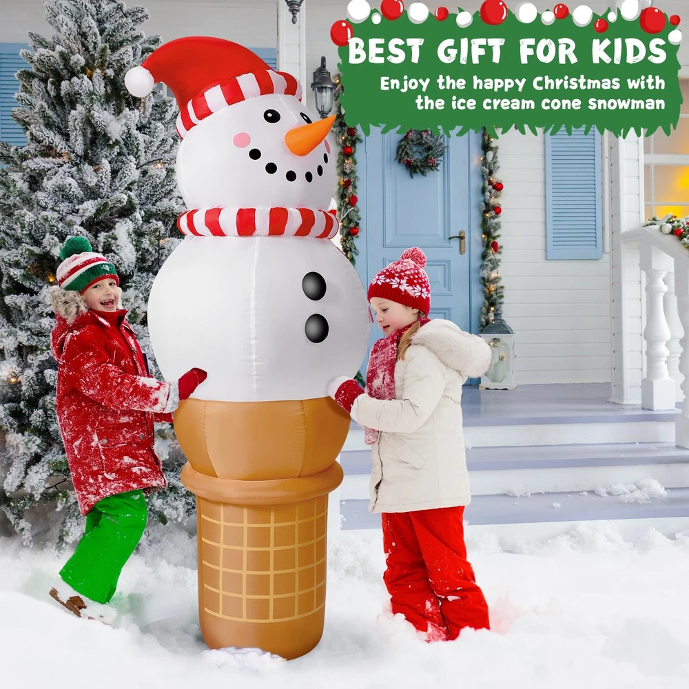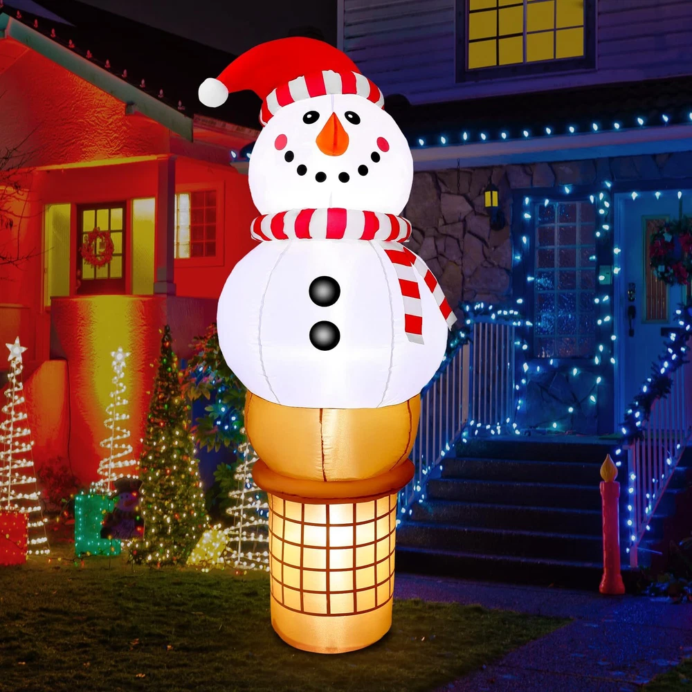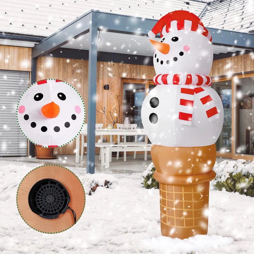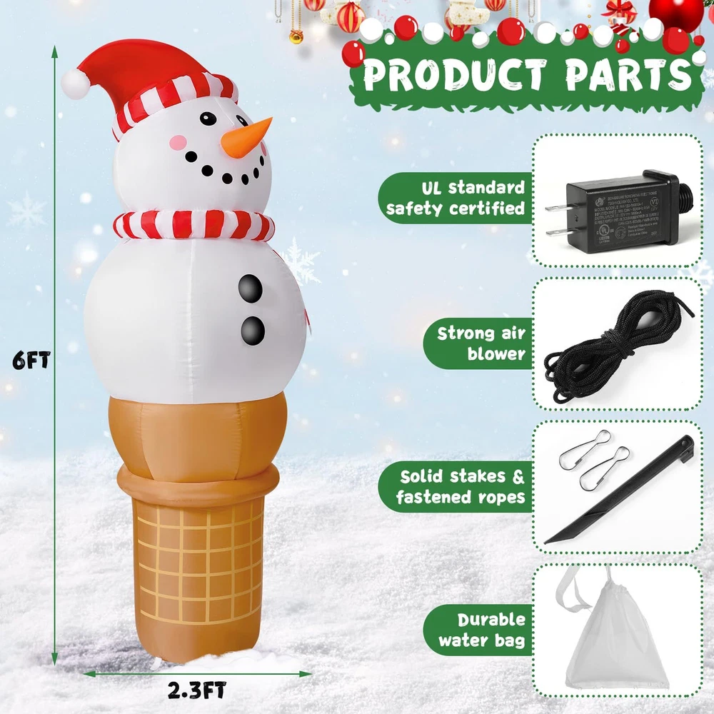 Raymall 6FT Christmas Inflatable Outdoor Decoration, Snowman Cone Christmas Inflatables Blow Ups Yard Christmas Decorations Outdoor Snowman Christmas Decor Inflatable Christmas Decorations Outdoor Cute Outdoor Christmas Decorations: The adorable 6 FT tall Christmas Inflatable Snowman Ice Cream Cone design is sure to catch kids' eyes and make kids exclaim in delight at how cute it is and will never forget this wonderful Christmas holiday Eye Catching LED Light: The Build-in Bright LED lights give it a great night effect. It is prefect For Christmas night party. Thanks to the cute design and bright LED lights, it is certainly eye-catching around your neighbors and guest Fast installation: With a strong air blower, just plug this inflatable snowman ice cream, only a minute it will be standing up to its full height, ready to delight all your neighbors and guests Safety to Use: No need to worry our Christmas Inflatable will fly away by the wind. It comes with ground stakes, fastened ropes, and built in sandbags to provide better resistant to the wind. Supported by a CE and UL-certified adapter, it is safe to use Great for Indoor and Outdoor Decor: Our Christmas inflatables snowman is suitable for indoor and outdoor use. Great to decorating yard, home, stage, shopping mall and any occasion you like. You also can send it to others as a Christmas gift Customer Service: If you have any question, please don't hesitate to contact us via "Ask a question" button at our store page. We will help you solve the problem in time