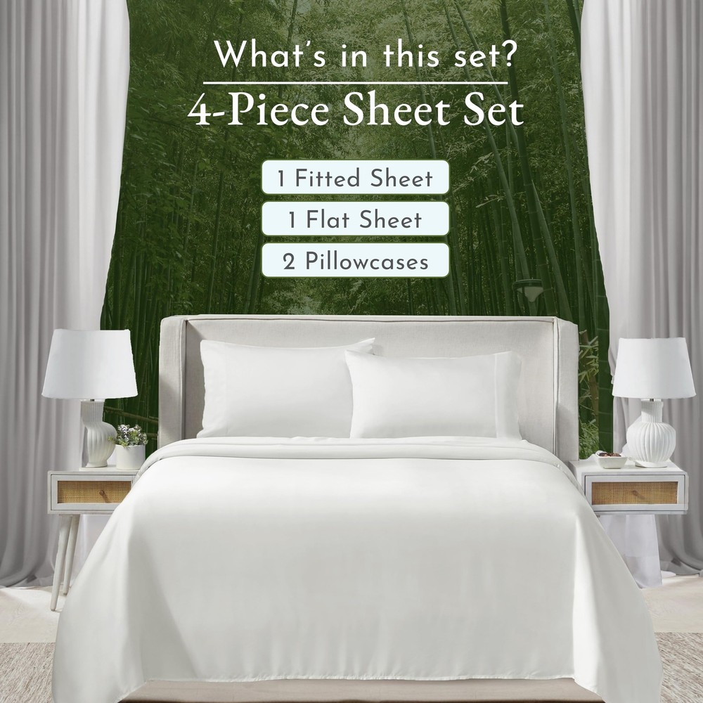 Experience unparalleled comfort with our 100% rayon from bamboo sheets. Designed for ultimate luxury, these sheets offer a silky, breathable feel that ensures comfort year-round. The rayon fabric is light and airy, effectively wicking away moisture and sweat for a restful sleep. Ideal for sensitive skin, it provides a cooler sleep experience and retains moisture to keep your skin soft and supple. The fitted sheet features all-around elastic for a perfect fit and includes a head/foot side indicator for easy bed-making. Machine washable, these sheets remain soft and smooth even after multiple washes, without shrinking, fading, or wrinkling. Enjoy the blend of elegance and practicality with these premium sheets. Cool Comfort for Restful Sleep: Experience our luxuriously soft and silky 100% rayon from bamboo queen sheets. This queen size sheet set regulates temperature and wicks away moisture, keeping you cool and comfortable year round, with the luxurious feel of a real queen silk sheets set but without the luxury markup. Perfect Fit: Our 4 piece ivory sheets queen size set includes a flat sheet (90"W x 102" L), a fitted sheet (60"W x 80" L), and 2 standard/queen pillowcases (20" W x 30" L). The fitted sheet features deep pockets and an all around premium elastic for a snug fit on mattresses up to 16 inches deep. A smart head side/ foot side tag ensures effortless, perfectly made beds every time. Durable & Easy to Care: These bedding sheets & pillowcases are crafted to withstand shrinkage, fading, and pilling. They maintain their luxurious softness and smooth drape even after countless washes. They are easy to care for. Toss them in the washer and dryer, and enjoy the feeling of freshly laundered luxury every day. Certified Safe Premium Quality: Made from the finest 100% Rayon derived from Bamboo, our sheets are Oeko Tex certified and free from harmful substances. Rest easy knowing your bedding is safe, sustainable, and gentle on your skin. Sustainable Comfort: Crafted with care, our sheets embody the perfect blend of luxury and responsibility. We’ve donated over 22,000 bedding pieces to local US charities and package our products sustainably without plastic. Experience exceptional support from our dedicated customer care team with every purchase.