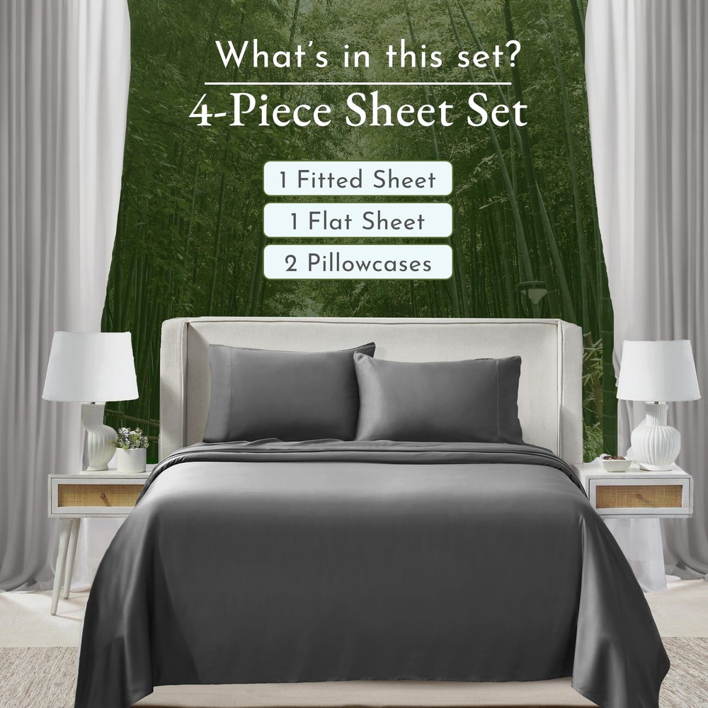 Experience unparalleled comfort with our 100% rayon from bamboo sheets. Designed for ultimate luxury, these sheets offer a silky, breathable feel that ensures comfort year-round. The rayon fabric is light and airy, effectively wicking away moisture and sweat for a restful sleep. Ideal for sensitive skin, it provides a cooler sleep experience and retains moisture to keep your skin soft and supple. The fitted sheet features all-around elastic for a perfect fit and includes a head/foot side indicator for easy bed-making. Machine washable, these sheets remain soft and smooth even after multiple washes, without shrinking, fading, or wrinkling. Enjoy the blend of elegance and practicality with these premium sheets. Cool Comfort for Restful Sleep: Experience our luxuriously soft and silky 100% rayon from bamboo sheets queen. This grey queen sheet set deep pocket regulates temperature and wicks away moisture, keeping you cool and comfortable year round, with the luxurious feel of real queen silk sheets but without the luxury markup. Perfect Fit: Our 4 piece queen size bed sheets set includes a flat sheet (90"W x 102" L), a fitted sheet (60"W x 80" L), and 2 standard/queen pillowcases (20" W x 30" L). The fitted sheet features deep pockets and an all around premium elastic for a snug fit on mattresses up to 16 inches deep. A smart head side/ foot side tag ensures effortless, perfectly made beds every time. Durable & Easy to Care: This rayon from bamboo queen sheet set is crafted to withstand shrinkage, fading, and pilling. It maintains its luxurious softness and smooth drape even after countless washes. These sheets are easy to care for. Toss them in the washer and dryer, and enjoy the feeling of freshly laundered luxury every day. Certified Safe Premium Quality: Made from the finest 100% Rayon derived from Bamboo, our sheets are Oeko Tex certified and free from harmful substances. Rest easy knowing your bedding is safe, sustainable, and gentle on your skin. Sustainable Comfort: Crafted with care, our sheets embody the perfect blend of luxury and responsibility. We’ve donated over 22,000 bedding pieces to local US charities and package our products sustainably without plastic. Experience exceptional support from our dedicated customer care team with every purchase.