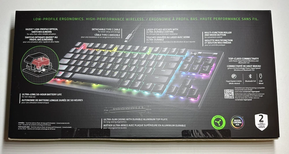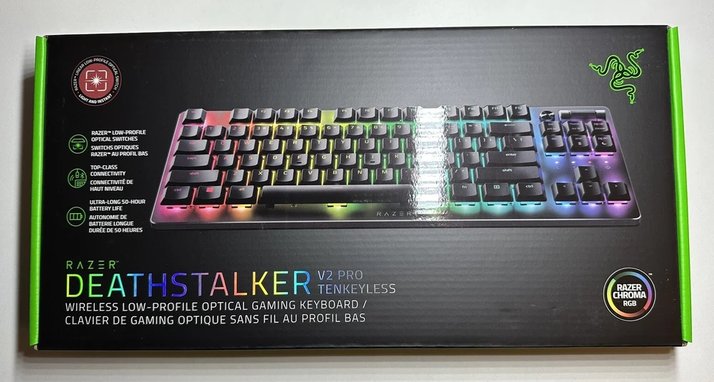 Unleash unparalleled typing precision with the Razer DeathStalker V2 Pro TKL Wireless Optical Gaming Keyboard. Engineered by Razer, this keyboard features high-speed wireless connectivity, ensuring that every keystroke is registered with accuracy and responsiveness. The compact tenkeyless design is perfect for gamers who demand portability without sacrificing functionality.Boasting a sleek design and a robust build, the DeathStalker V2 Pro is equipped with a 2-year labor warranty and a manufacturer warranty for added peace of mind. Rely on Razer's renowned quality to enhance your gaming setup, providing a seamless and enjoyable experience.