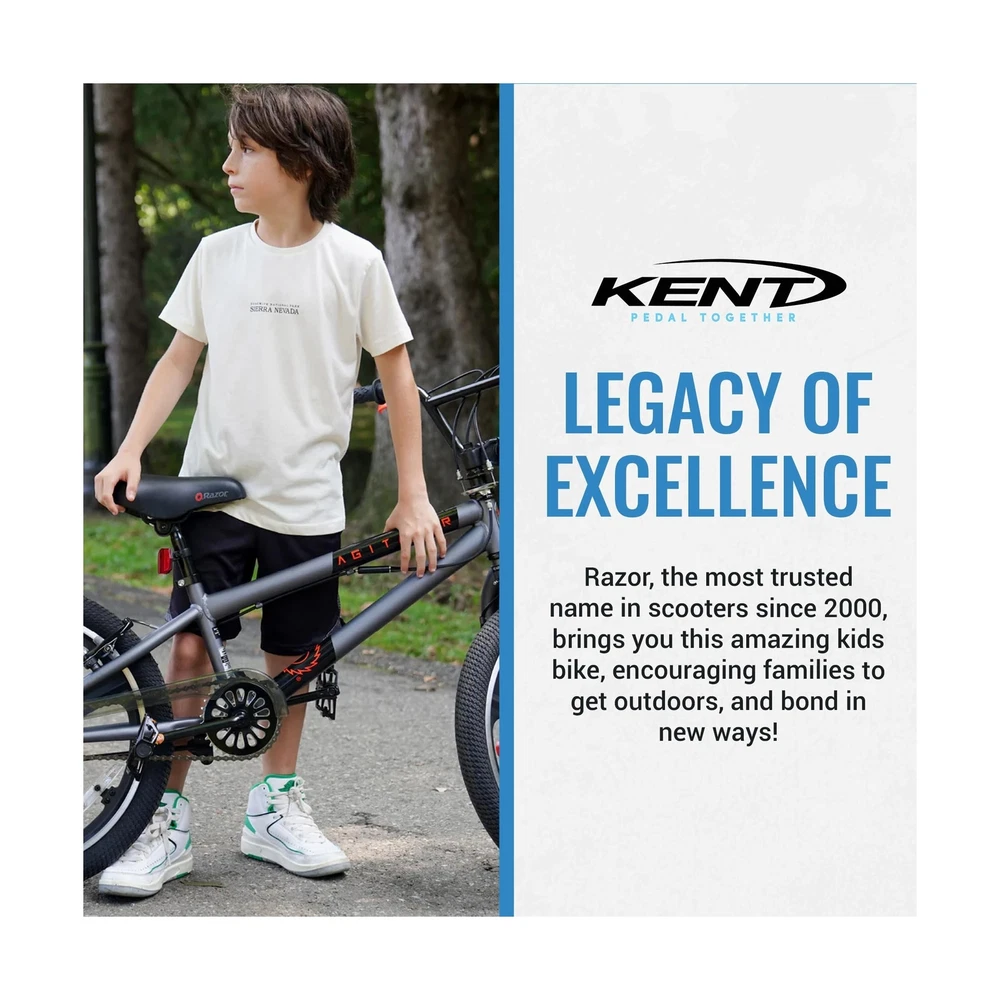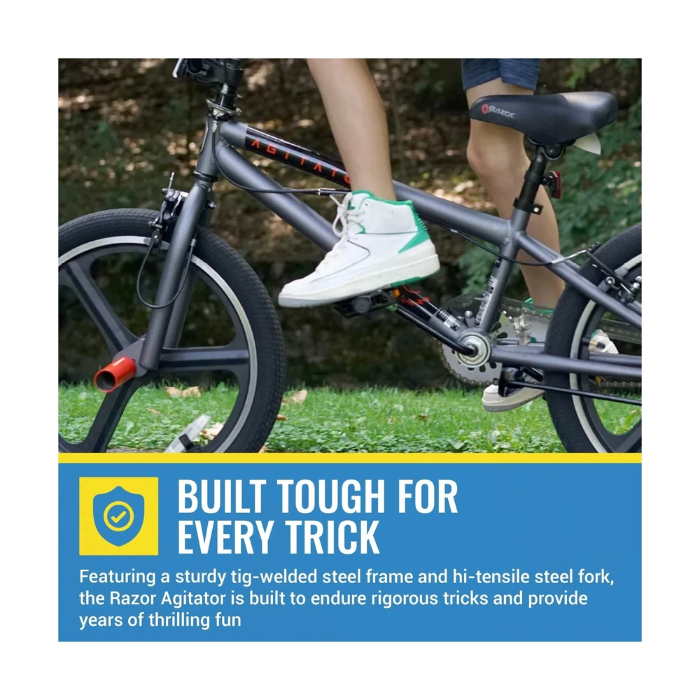 Razor Agitator BMX/Freestyle Bike - 20 Inch Bike for Boys - Quick Release Adjustable Seat Post - BMX Bicycle with Front and Rear Brakes, Steel Frame and Fork, and Front and Rear Pegs Description The Razor Agitator BMX/Freestyle Bike is perfect for young riders looking for a fun and stylish ride. With its sleek design and vibrant color, this bike is sure to impress in any park or neighborhood. The front and rear hand brakes provide excellent stopping power, while the 20-inch BMX/Freestyle tires and lightweight alloy mag wheels ensure a smooth and safe ride. Designed for comfort, the Razor Agitator features a quick-release adjustable seat post, adjustable handlebar, and padded saddle, offering a perfect fit for your child’s adventures. Built with a tig-welded steel frame and a hi-tensile steel fork, this durable 20 inch boy’s bike is made to handle the excitement of BMX and freestyle riding for years of fun. Features: Sleek and Cool BMX Bike for Kids: Featuring a sleek design with vibrant colors and cool front and rear pegs kids love, the Razor Agitator is a showstopper for BMX and freestyle fun. Simple yet stylish, watch your child smile ear to ear as they ride! Custom Comfort: This 20 inch BMX bike features a quick-release adjustable seat post, adjustable handlebar, and a padded saddle, ensuring the perfect height and comfort for your childs ridewhether practicing tricks or cruising the neighborhood. Ride with Confidence: Ensure your child's safety with front and rear hand brakes providing excellent stopping power, while the 20-inch BMX/Freestyle tires and lightweight alloy mag wheels ensure a smooth ride and enhanced braking efficiency. Safe and Sturdy: Sporting a tig-welded steel frame and hi-tensile steel fork with neon red accents, the Razor Agitator is designed to withstand rigorous use and tricks for years of fun in the park or neighborhood. Trusted Brand: Razor, the most trusted name in scooters since 2000, brings you this amazing kids bike! We design our products to grow with your kids, encouraging the whole family to step away from screens, get outdoors, and bond in new ways. Product Details: Bike Type: Multi-Use Bike, BMX Bike Age Range (Description): Kids Brand: Razor Number of Speeds: 1 Color: Silver Wheel Size: 20 Inches Frame Material: Alloy Steel Suspension Type: Rear, Front Special Feature: freestyle Included Components: Kickstand, Owner's Manual CPSC Reflectors Bike Type: Multi-Use Bike, BMX Bike Age Range (Description): Kids Brand: Razor Number of Speeds: 1 Color: Silver Wheel Size: 20 Inches Frame Material: Alloy Steel Suspension Type: Rear, Front Special Feature: freestyle Included Components: Kickstand, Owner's Manual CPSC Reflectors Size: 20 inch Brake Style: Linear Pull, Caliper Specific Uses For Product: Road Item Weight: 37.5 Pounds Theme: Freestyle Bmx Style: Freestyle Bmx Model Name: Razor agitator bmx freestyle bike Power Source: Pedal power Wheel Material: Aluminum Year: 2019 Seat Material Type: Durable synthetic leather or rubber Maximum Weight Recommendation: 250 Pounds Assembly Required: Yes Number of Handles: 2 Skill Level: Intermediate Global Trade Identification Number: 62 UPC: 016751920962 Manufacturer: Kent International Inc. Item Package Dimensions L x W x H: 45 x 23 x 8 inches Package Weight: 17.17 Kilograms Item Dimensions LxWxH: 50 x 25 x 35 inches Brand Name: Razor Warranty Description: 1 year Parts, Limited Lifetime on Frame Material: Steel Suggested Users: unisex-teen Number of Items: 1 Part Number: 92096 Date First Available: June 19, 2019 Delivery We Do Not Ship Outside of the Continental US. Return Policy All items qualify for returns within 30 days of receipt. Buyer is responsible for return shipping on any item that is not damaged. Feedback We take our reputation seriously, we buy and sell online, so we understand the value of trust. If you are unsatisfied with your order, please contact us and we will work with you to resolve it to your satisfaction.