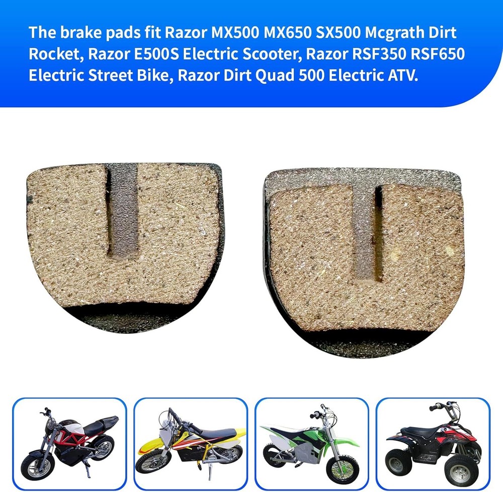 Free eBay listing template designed by dewiso.com Rounded Disc Brake Pads for Razor Dirt Quad 500 E500S MX500 MX650 SX500 McGrath Dirt Rocket RSF650 Motovox Electric Dirt Bike Electric Scooter Sportbikes ATV YK2 Flame Brake Caliper Part 4 Pack FREE AND FAST SHIPPING! About this item 【Package Include】4 x Rounded Brake Pads, 2 x Spring Clamps, 1 x Allen Wrenches, 2 x Socket Head Screws 【Fitment】Razor Front Rear Brake Pads are Compatible with Razor Dirt Quad 500 E500S MX500 MX650 SX500 McGrath Dirt Rocket RSF650 electric sportbikes, electric dirt bikes and quads.Suitable for YK2 flame caliper parts 【Features】large particle wear-resistant material, high temperature resistance, good resistance to water rot and heat rot, strong and durable, stronger braking force, can be used for a long time, easy to install. The upgraded spring clips make the braking effect of the disc brake more sensitive 【Easy to Install】Easy installation only takes a few minutes with a few simple tools, brake pads can be used for some popular models from Razor, Motovox, eZip, IZIP, and Schwinn dirt rocket quad electric scooter bikes 【Size】Length:24.5mm / 0.96inch, Width: 24mm / 0.94inch, Height: 5.5mm / 0.21inch 【NOTE】Please check as much as possible the item picture, model and size carefully to confirm the compatibility › Product We offer a 30-Day Return Policy on items which you are not completely satisfied with. You have the option for a full-refund or an exchange of the item. No returns are available on items shipped outside of the US . Shipping We offer Free Shipping to the US and ship within 2 business days of payment, usually sooner. We use UPS express shipping. That's why your products are usually delivered within 3 days . Contact We try our very best to make sure every customer is completely satisfied. If there's a problem , message us! We're happy to help. 24/7 live chat available.