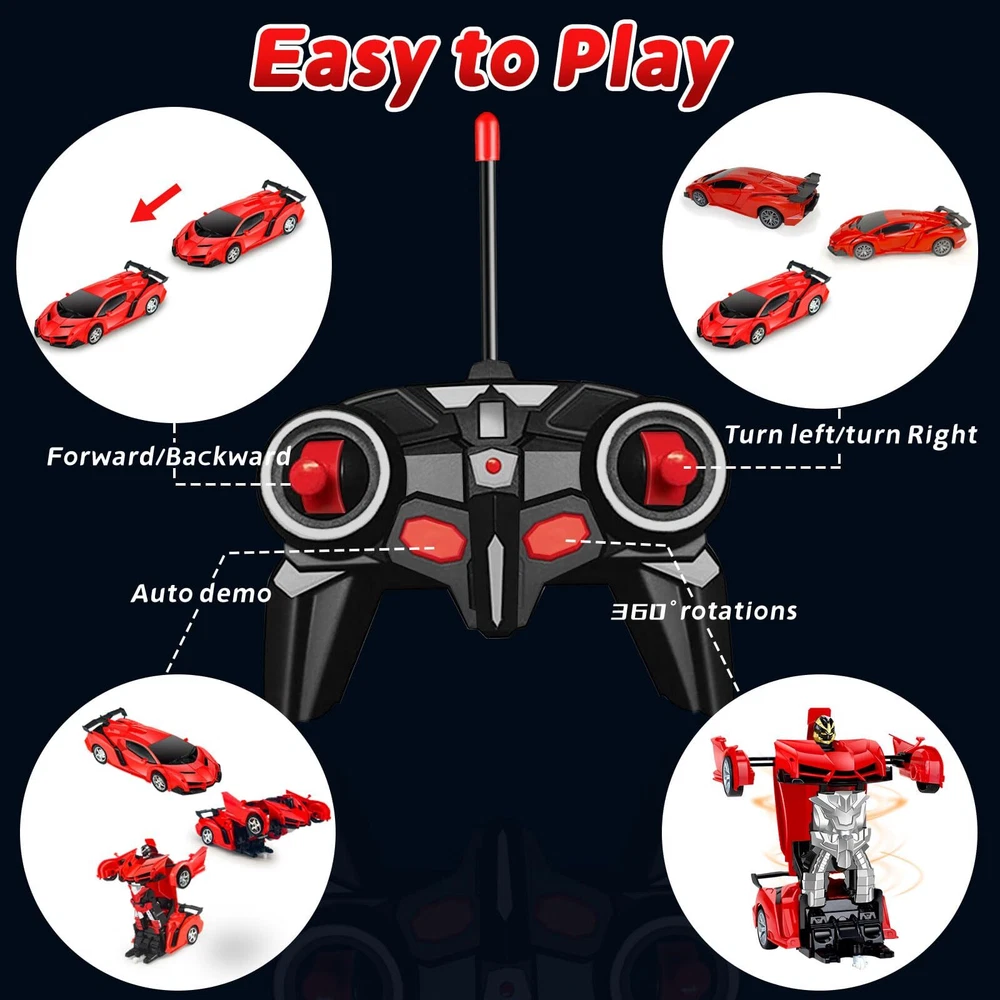 Remote Control Car, Transform Robot RC Cars for Toys, 1:18 Scale Transformation Car Toys with 360 Degree Rotating Drifting, Boys Toys Gift. The remote-controlled deformation car provides lots of fun for who love cars and robot! Bring a different racing experience. Simple controls offer a button transformation so your can start playing with no learning curve. Give for a transformation robot car toy present! The best choice for Christmas and New Year, birthday, Easter, Children's Day,Halloween,Thanksgiving Day. 🚗💨NOTE: 1. When receiving a deformed car, please do not force the toy car by hand or manually deform the toy car, which will easily damage the toy car. kid's favorite toy at once. What a joy to play with your friends! 2. when you press the button on the controler or with your hand to sense, it will change from a car to a robot in second. The -in-gameplay of new technology allows children to enter the novel field of thought. The operation is simple, and the can become familiar! 2 In 1 Rc Robot Car: 1:18 scale rc transforming car. Robot car with cool led lights, headlights will glow with control car. Rc car toys can switch freely between the car and the robot to keep your entertained for the day 360° Rotation & -Click Deformation: Our remote control car have click deformation and can forward, reverse, left, right, 360° rotation and drift in the form of a robot or a car. Auto demo functions will running alternating between car and robot modes.Transform car simple operation is great gifts for boys girls age 3+ High Quality & Safe to :This deformation robot rc car for is made of sturdy and ABS plastic material, which is collision resistant and environmental-friendly, your have a lasting and happy entertainment Great Gift for 3-12 Years Old :Rc transform car toys is pink colors design and 2 fun ways to play.The remote control car in a beautiful box as boy girls for ages 3 4 5 6 7 8 9 12 birthday gifts,Halloween, Christmas gifts or party gifts After Sales Service: When you receive the remote control car, please noted: do not deform the toy car with force or manually, it is easy to damage the toy car. If you receive the robot car and find that it does not meet your expectations, please us, thank you