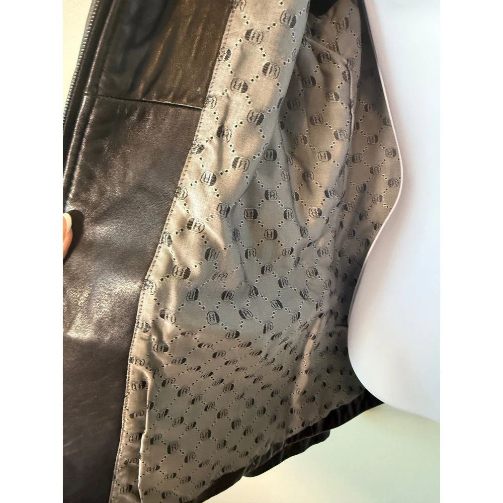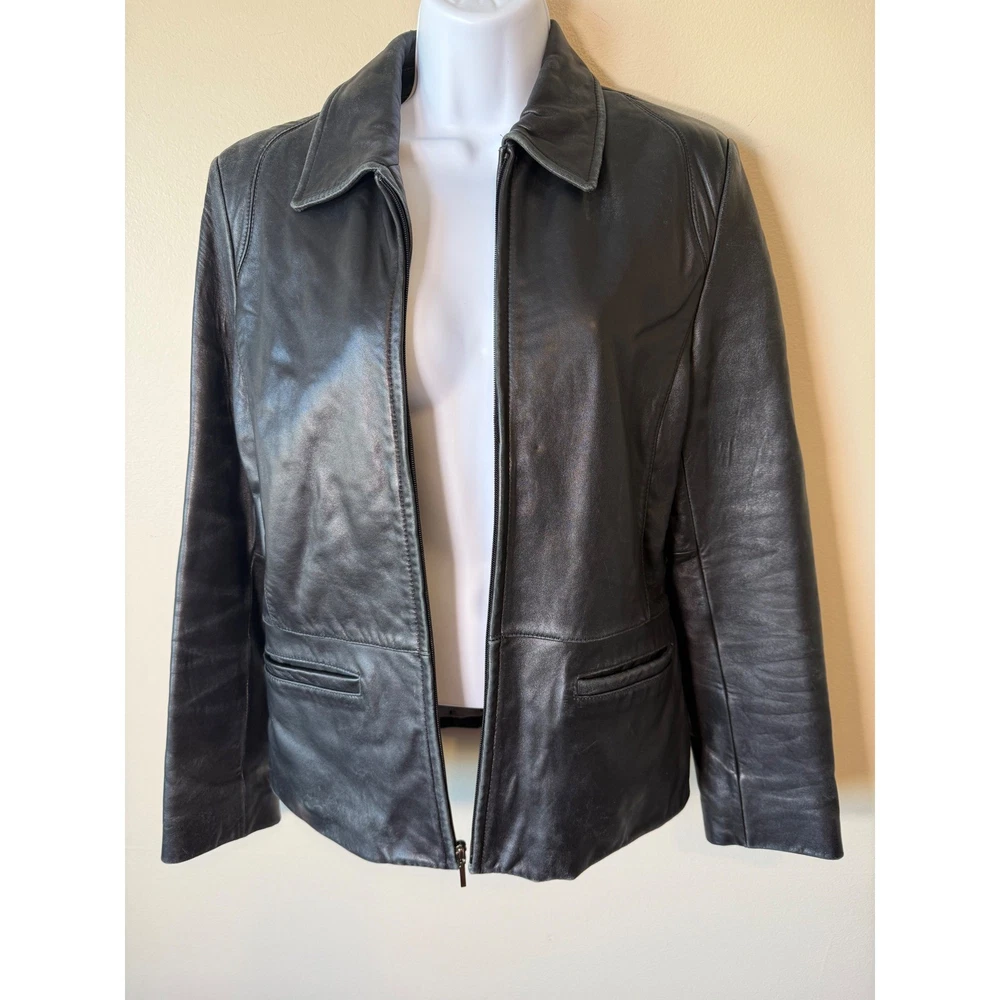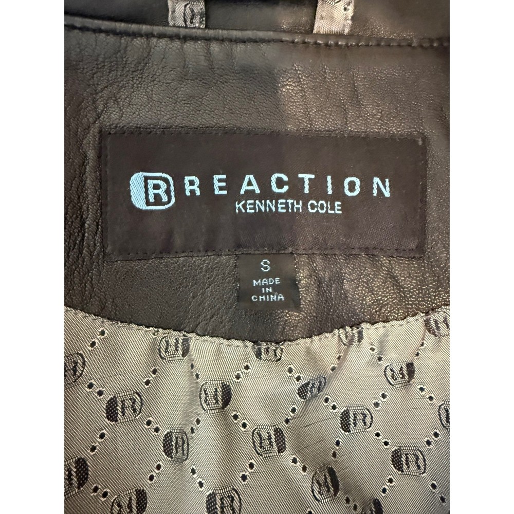 ** see pictures of general wear in areas***Command attention with this Reaction Kenneth Cole leather jacket. Luxurious and undeniably chic, this jacket features a classic collared design that exudes timeless sophistication. The smooth, full zip closure allows for effortless layering, while the tailored silhouette enhances your figure. Its sleek black finish is versatile enough to complement any outfit, seamlessly transitioning from day to night. Imagine yourself confidently navigating a bustling city street, or adding an edgy touch to a sophisticated evening ensemble. Perfect for a stylish coffee run or a casual Friday at the office, this jacket is a must-have for the modern woman. Type: Jacket Outer Shell Material: Leather Style: Basic Jacket Department: Women Color: Black Lining Material: Polyester Features: Full Zip, Pockets, Collared Accents: Zipper Pattern: Solid Jacket/Coat Length: Short Insulation Material: Synthetic Season: Fall, Spring Closure: Zip Occasion: Casual Keywords: Reaction Kenneth Cole leather jacket, womens leather jacket, black leather jacket, zip up leather jacket, collared jacket, small leather jacket, designer jacket, classic leather jacket, outerwear, fashion jacket, leather coat,
