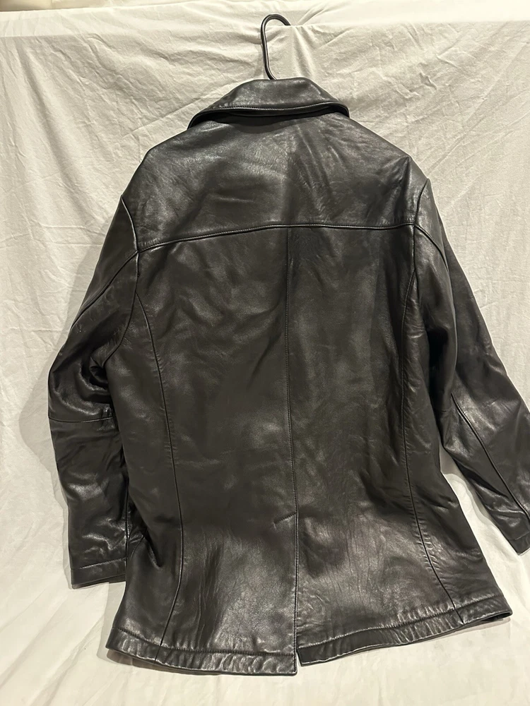 A stylish and versatile women's black leather jacket from Kenneth Cole in size L. Suitable for men or women. This mid length- long jacket features a full zip closure, long sleeves, and is lined with polyester for warmth. It is made of real genuine leather, has a classic solid pattern and a back slit. Ideal for travel or casual wear during fall and winter seasons, this jacket also includes pockets, including a hidden inside pocket, for convenience.