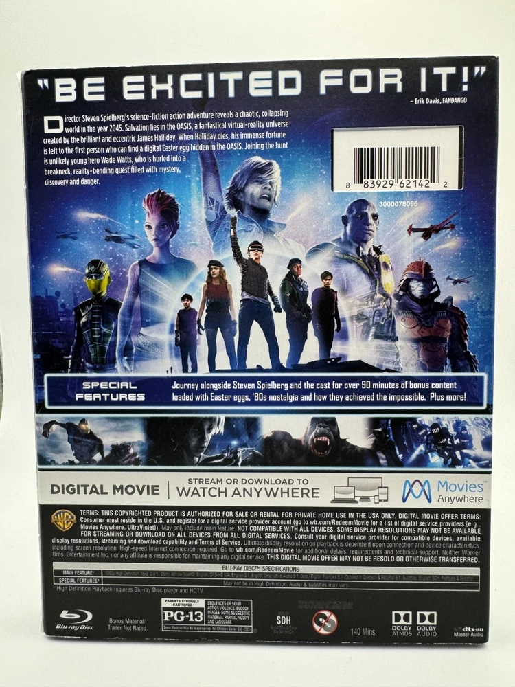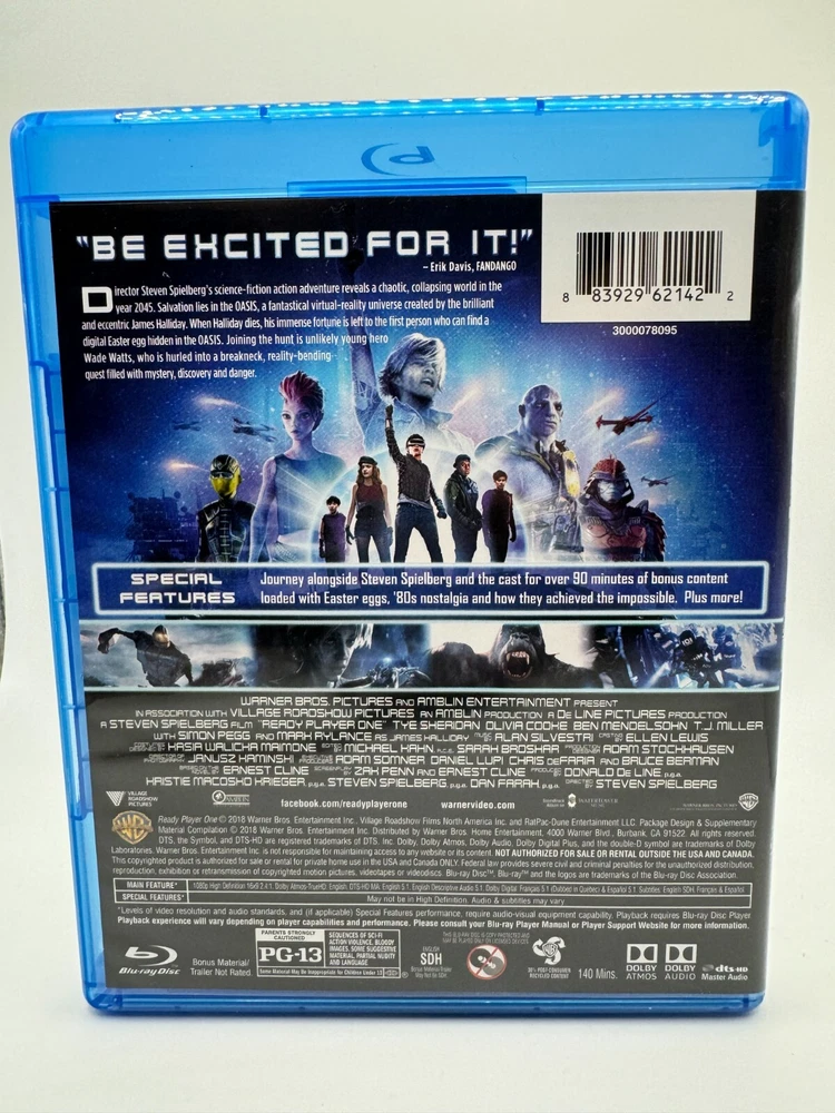 Actor:Tye Sheridan, Olivia Cooke, T.J. Miller, Simon PeggMPN:unknownCountry/Region of Manufacture:UnknownStudio:Warner BrosAspect Ratio:16:9Language:EnglishCase Type:Blu-ray CaseCustom Bundle:NoSubtitle Language:English, French, Spanish, Canadian FrenchType:MovieSeason:1Rating:PG-13Region Code:DVD: 1 (US, Canada...), Blu-ray: A (Americas, Southeast Asia...)UPC:883929621453Features:WidescreenRelease Year:2018Director:Steven SpielbergRun Time:140 minutesMovie/TV Title:Ready Player OneFormat:Blu-rayVideo Format:NTSCSub-Genre:Cyberpunk, CyborgsEdition:Special EditionGenre:Sci-Fi & FantasyProducer:Donald De Line, Kristie Machosho Krieger, Steven Spielberg, Dan FarahSeller Notes:“in great condition, sold as in pictures”gtin13:883929621453
