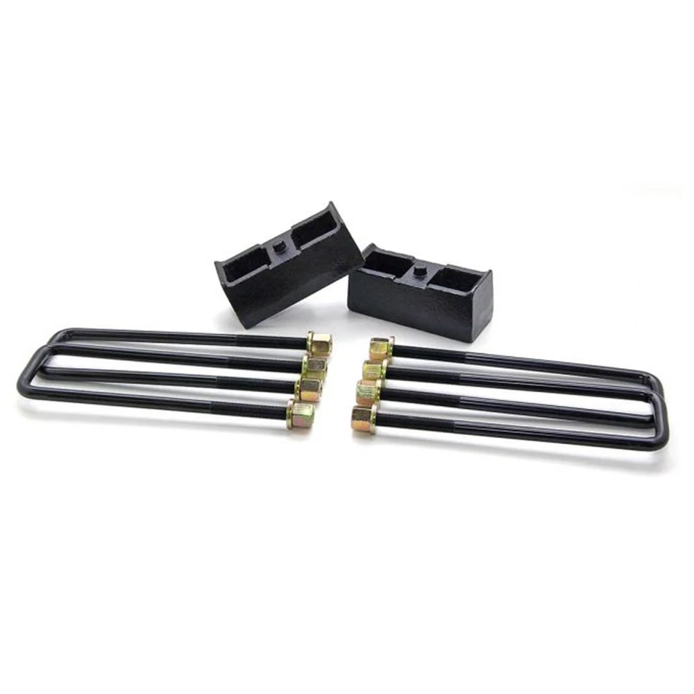 $ImageURL1$ ReadyLIFT, Ready Lift, 66-3002, 663002, 2.25", 2.25in., Rear Block Kit, Suspension, Lift, Lifted, Raised, 6-Lug, Chevy, Chevrolet, Silverado, Sierra, GMC, RWD, 2WD, 4WD, 4x4, Standard Cab, Crew Cab, Extended Cab ReadyLIFT Suspension Rear 2" Block Kit for Silverado Sierra 1500 6-Lug 66-3002 PART NUMBER: 66-3002 BRAND: ReadyLIFT DESCRIPTION ReadyLIFT 2.25" Rear Block Kit ReadyLIFT OEM-style rear block kits are available for model specific applications. Based on OEM designs and never made out of light weight extrusions ReadyLIFT's 2.25" GM Blocks are made from cast iron and have anti-rotation ears built-in. Fits 1999-2021 classic and current body style 6-lug model GM trucks. 2007-2018 2WD and 4WD trucks with OEM 1.25" blocks will want to take advantage of the additional 1" of lift for towing and hauling, particularly when using a front leveling kit. This block is 2.25" which, when removing the factory 1.25" block, results in 1" of increased rear lift. 1999-2006 2WD trucks [which have no rear block] will to take advantage of 2.25" lift using the 66-3002 ReadyLIFT Rear Block Kit. This kit eliminates the dangers of having to stack blocks which may be illegal in some states. ReadyLIFT Block Kits will put a slight rake back in your truck for hauling or towing and are designed to work in concert with your ReadyLIFT Suspension Leveling Kit. Like all ReadyLIFT products these block kits come with a Lifetime Warranty. Every ReadyLIFT Rear Block Kit comes complete with one pair of OEM- quality e-coated cast iron rear blocks, model and size-specific U-bolts, hardware and instructions. Kit Components: (2) 2.25" Rear Blocks (4) E-Coated U-Bolts (8) Nuts and Washers Will safely lift the rear of your truck an additional 1" to 3" depending on the application Note: 2019-UP trucks may need to trim off excess bolt length after installation. Note: Not for use on 2019-2022 GM 1500 trucks with the composite rear overload. Note: This GM 1500 kit is NOT COMPATIBLE with vehicles equipped with rear composite mono-leaf springs. The mono-leaf is easily identifiable ‚ the U-bolt is round/circular around the top of the leaf spring. This kit only works with vehicle equipped with traditional steel leaf springs ‚ identified by ‚Eosquare‚ U-bolts.