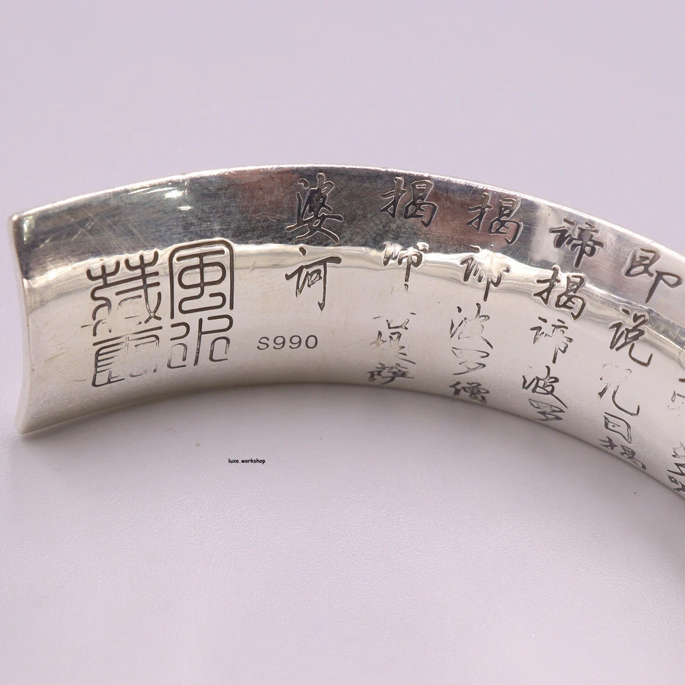 Our picture, description, Unauthorized Use is Strictly Prohibited.---eBay Seller: luxe.workshop SPECIFICATIONS The item Are Made By Pure 990 Silver,it support test Metal:Pure Silver 990(Fine Silver) Bangle Inside Diameter:Can adjust from 60mm (2.36inch) to 62mm (2.44inch), Fit the wrist width less than 2.44inch Silver Weight:74-75g Band Width: 19mm Stamp:S990 If you encounter silver products turning black or yellow, please do not worry. This is due to silver oxidation. You only need to follow the cleaning method on our details How to Choose fit Bangle: Measured wrist width,the wrist width need less than bangle inside diameter How to wear an open bangle: Pull the bangle with equal force on both hands (just gently pull it). Wear it from the narrowest part of the wrist(The opening of the bangle is not easily widened when being pulled apart) . After putting it on, close the bangle(Dear, you're all set with the wearing now). The function of silver: Silver products can generate a magnetic field within a certain range, releasing a large amount of silver ions. Silver ions have strong bactericidal effects and have health benefits for the human body. It not only has economic value, but also is beautiful and generous. The ancients said that carrying silver will accompany health, wealth, and prosperity, not only because of its precious metal, Medically, it has a higher efficacy on human health than gold. What does 990 silver mean? 990 silver refers to silver products with a silver content of about 99.0%, and a purity of about 99.0% is recognized as pure silver, which is soft and easily oxidized . Why does silver jewelry turn black after wearing it for a long time? The blackening of silver jewelry worn is a normal oxidation. Because silver reacts chemically with sulfur in the air over a long period of time to produce black silver sulfide, it can cause silver jewelry to gradually turn black. How to deal with blackened silver jewelry? You can try using a drawing eraser to wipe away the slight black oxide on the surface of the silver jewelry. You can try applying a small amount of toothpaste on the surface of the silver jewelry, then using a toothbrush dipped in warm water to scrub, and finally drying it with a full wool soft cloth. When the surface of silver jewelry shows slight discoloration due to mild corrosion, it can be gently wiped with detergent or hot medium-sized soap. First, use a soft bristled brush to wash, and then dry with full wool soft cloth. At this time, the silver jewelry will show its original brightness. Wash the silver jewelry by heating it with laundry detergent and boiling water to form a solution, then wet the surface with phosphoric acid solution and wipe it with a cloth to make it cleaner. When silver jewelry oxidizes, it presents a light coffee color. It can be wiped with a soft cloth dipped in a little silver oil, soaked in silver washing water, or directly wiped with a silver cloth. Soak the silver jewelry in silver washing water for a while, then take it out and rinse it with clean water. Thai Silver Maintenance: The best maintenance method for Taiyin is the same as jade, which is to wear it every day. The natural oil produced by the human body can keep Taiyin jewelry warm and shiny. (Of course, there are exceptions. Some people's sweat contains ingredients that can turn silver black.) When not wearing it, it is important to pack it in a closed bag to prevent the surface of the silver jewelry from oxidizing and turning black when exposed to air Daily cleaning method: Put some toothpaste on the silver jewelry, add some water, rub it appropriately until small bubbles appear, and then rinse with clean water to restore its shine. When wearing silver jewelry, do not wear other precious metal jewelry at the same time to avoid collision, deformation or abrasion. Do not wear while taking a shower, as some cleansers and shampoos contain alkaline ingredients that can oxidize and corrode Thai silver; Do not wear it when swimming, especially when swimming in seawater or soaking in hot springs. Wearing silver jewelry requires regular cleaning. When wiping silver jewelry, a soft cloth, preferably a professional one, should be used. Silver wiping cloth contains maintenance ingredients and cannot be washed with water. The difference between pure 999 silver and Thai silver 925: The natural color of pure silver jewelry is generally yellowish. In order to float, chemical plating is used to coat a layer of silver on the surface of pure silver, which is a bright white color. Some pure silver surfaces are not coated with bright silver using chemical plating methods. This type of pure silver tends to be yellowish, revealing the natural color of silver, which is beige. Thai silver, Its craftsmanship comes from Thailand. In terms of material, it is 925/990 pure silver, which is a special term for a vintage and special craftsmanship. Also known as' Wuyin '. Due to special anti-aging treatment, black silver jewelry not only does not change color for a long time, but also greatly enhances its surface hardness. The unique texture and color make this jewelry rough and rustic. SHIPPING POLICY Our All Items Will Be Dispatched Within 1-5 Business Day By Airmail After The Payment Is Clear. . Generally You Will Receive Your Order Within 10-45 Business Days After We Dispatched Your Package To The Delivery Company. We Cannot Guarantee The Delivery Timeframe If The Post Office Has Any Unexpected Delays Due To Holiday, Weather, Customs, Or Other Conditions. Please Choose Some Local Sellers, If You Cannot Wait Patiently In The Shipping Time We Declared. We Appreciate Your Patience If You Haven't Received Items In 60 Days(Due To Local Delivery System And/Or Customs). If You Are Concerned In Any Way, Please Feel Free To Contact Us Via Ebay Message Instead Of Leaving Negative/Neutral Feedback Or Opening A Dispute. We Will Make Every Effort To Fix Any Problem(Resend Or Refund Any Missing Item). Customs Duty Is Obli