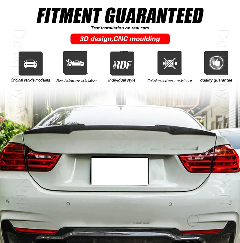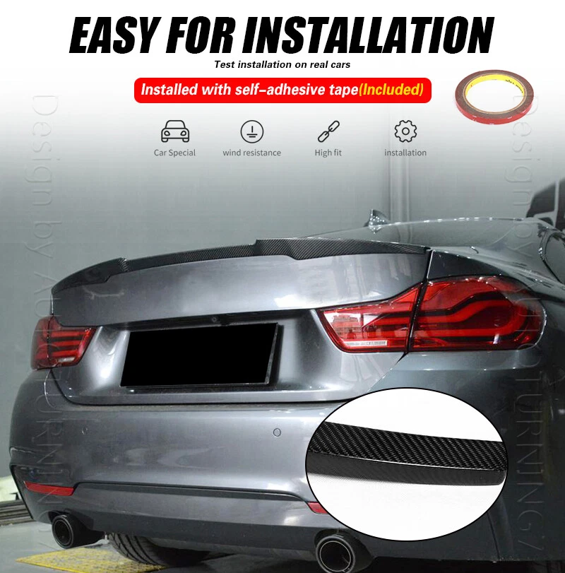 Fitment: Fits for 4-Series F32 Coupe 2013-2020 Specifications: Product Name: Rear Spoiler Material: Carbon Fiber Package Size: 123*22*11cm Package Weight: 1.64kg Features: Made of High Quality Lightweight Carbon Fiber. Latest Design GT Wing Spoiler Completed Kit, Improve Handling And Make Tail More Stable in High Speed. Water Transfer Carbon Fiber for Highest Durability and Appearances. Adjustable Angles for Customizable Usages and Efficiencies, Enhances Aerodynamic. Reduces Drag, Increases Fuel Efficiency, Reinforces Downforce, Traction and Stability. Double-sided adhesive paste, Easy to Install. Package included: 1 x Spoiler with self-adhesive glue tape Carbon Fiber Spoiler FOR BMW The Rear Trunk Spoiler is one of the simplest mods you can do to the exterior of your car that will give your car that completely different look. Not only are spoilers meant for great looks, they also help with the aero dynamics of the car by lowering drag, or helping to put more downforce on the car making sure that the wheels stay grounded for maximum traction. Fitment: Fits for 4-Series F32 Coupe 2013-2020 Specifications: Product Name: Rear Spoiler Material: Carbon Fiber Package Size: 123*22*11cm Package Weight: 1.64kg Features: Made of High Quality Lightweight Carbon Fiber. Latest Design GT Wing Spoiler Completed Kit, Improve Handling And Make Tail More Stable in High Speed. Water Transfer Carbon Fiber for Highest Durability and Appearances. Adjustable Angles for Customizable Usages and Efficiencies, Enhances Aerodynamic. Reduces Drag, Increases Fuel Efficiency, Reinforces Downforce, Traction and Stability. Double-sided adhesive paste, Easy to Install. Package included: 1 x Spoiler with self-adhesive glue tape Delivery details Payment and TAX Warranty Policy Return Policy Contact us Delivery details NOTE: The shipping fee is only for the mainland of each country, it does not include the overseas territories, such as Virgin Islands (U.S.) , Puerto Rico, Hawaii , French Reunion Island, etc. But on ebay, when buyers from Puerto Rico and overseas territories , the shipping fee is equal to United States, it is NOT correct,. please contact us for correct shipping fee, or we will cancel the order. Sorry for the inconvenience, and thanks for your cooperation. 1. If you want to upgrade the shipping, please contact us before making payment, we will revise the shipping fee. 2. We will ship according to your Ebay address. Please make sure it is correct and include phone number for delivery. If you want to know the exact shipping time , please contact us . Payment and TAX 1.We accept Multiple Payment Methods Available: Credit Card, Debit Card, Gift Card, Apple Pay, Goggle Pay, PayPal and PayPal Cred. 2.Please leave note for your special request (e.g. Colors or Size) in ebay note when you pay the order. 3.Your must complete the payment within 7 days or Ebay will automatically open unpaid item case For US Buyer:The invoice value of each item is less than 800USD ,so you no need to pay any tariff . NON-US Buyer Note: Most countries are tax free based on our invoices, if tax is required, which will be buyer's responsibility. Warranty Policy We Warranty Our Product Within the Limited Warranty Policy Specified on Ebay. Please Email us if ou have any question regarding the warranty policy on a specific item. Most of the items are Aftermarket Parts and they are intended for off-road usage only, therefore no installation instruction will be included, Professional installation are Highly Recommended. We are not responsible for any damages to the item or the vehicle that occur during the installation of the item.Also, Please Make Sure Proper Installation is Performed as we are not responsible for item being missing or flew off after the installation. if you don't think the item can stay on the car properly, please do not attempt to drive the car with it and please check with professional shops/mechanics or contact us for assistance. Return Policy We Accept Returns Within the Return Period On Ebay. Return Authorization/Return Approval is Required For Every Return. So If you Wish to Make a Return On Your Purchase. Please Contact us Before You Send The item back For any damages occured to the item upon arrival, Please notify us within 5 days of the delivery so we can take proper action to fix the issue. So Please Kindly inspect and check the item condition upon arrival.For Any other Return Inquries, You can contact us within the return period to obtain return authorization/return approval. In case of return, the merchandise needs to be returned in original condition with origi- nal packaging in order to be eligible for an exchange or a refund. Items must be not opened in their original package. Any mark of installation, mounting, cutting, scratch or using will not be allowed. Contact us 1.We are trying our best to explain all details of the products here! If you have any question, please feel free to contact us by Ebay message, and We will get back to you within 24-48 hours. 2.Customer satisfaction is our NO.1 priority. If you are not happy with the item that you purchase, please contact us first. We will try our best to solve the problem with you.Please leave us a positive feedback if you receive the item.Please do not leave negative or neutral feedback without any contact.If you haven't received item in 30 days, please contact us and we will arrange refund.We appreciate your business.Happy Bidding & Have a nice day! 3.Working hours: From 8 a.m. to 6 p.m. from Monday to Friday. From 8 a.m. to 12 a.m. on Saturday morning Holiday/Rest time: Saturday afternoon and Sunday
