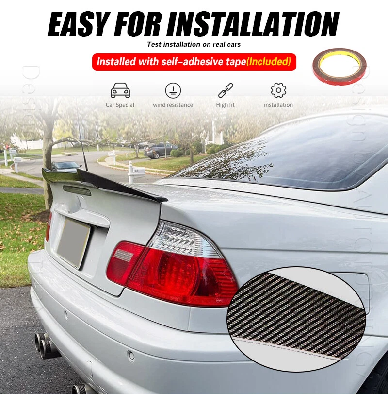 Features: 1.Fitment: For BMW 3 Series E46 316i 318i 320i 323i 325i 328i 330i M3 Sedan 4-door 1998-2005 2.3*3 Twill Weave Carbon Fiber material, with polished and shinning surface, ten times tough than steel 3.High Quality UV-Protected Clear Coating, Surface is smooth and shiny,enhance the appearance of the vehicle 4.3D design,CNC moulding,test installation on real cars, good fitment guaranteed 5.Car rear trunk spoiler are designed to factory specifications for easy installation and clean,installed with self-adhesive tape.peel off the tape on the back, then stick the spoiler on the lid of the trunk. It is easy to clean in daily use. 6.Impresses with its fitting accuracy and emphasizes the sporty lines of your car,stylish design gives a customized look 7.Add downforce, detach airflow, enhanc Carbon Fiber Spoiler FOR BMW The Rear Trunk Spoiler is one of the simplest mods you can do to the exterior of your car that will give your car that completely different look. Not only are spoilers meant for great looks, they also help with the aero dynamics of the car by lowering drag, or helping to put more downforce on the car making sure that the wheels stay grounded for maximum traction. Fitment: Fits for BMW 3 Series E46 316i 318i 320i 323i 325i 328i 330i M3 Sedan 4-door 1998-2005 Specifications: Product Name: Rear Spoiler Material: Carbon Fiber Size: Length 116cm Package Size: 123*31*11cm Package Weight:1.56kg Features: Made of High Quality Lightweight Carbon Fiber. Latest Design GT Wing Spoiler Completed Kit, Improve Handling And Make Tail More Stable in High Speed. Water Transfer Carbon Fiber for Highest Durability and Appearances. Adjustable Angles for Customizable Usages and Efficiencies, Enhances Aerodynamic. Reduces Drag, Increases Fuel Efficiency, Reinforces Downforce, Traction and Stability. Double-sided adhesive paste, Easy to Install. Package included: 1 x Spoiler with self-adhesive glue tape Delivery details Payment and TAX Return Policy Warranty Contact us Delivery details NOTE: The shipping fee is only for the mainland of each country, it does not include the overseas territories, such as Virgin Islands (U.S.) , Puerto Rico, Hawaii , French Reunion Island, etc. But on ebay, when buyers from Puerto Rico and overseas territories , the shipping fee is equal to United States, it is NOT correct,. please contact us for correct shipping fee, or we will cancel the order. Sorry for the inconvenience, and thanks for your cooperation. 2. If you want to upgrade the shipping, please contact us before making payment, we will revise the shipping fee. 3. We will ship according to your Ebay address. Please make sure it is correct and include phone number for delivery. If you want to know the exact shipping time , please contact us . Payment and TAX 1.We accept Multiple Payment Methods Available: Credit Card, Debit Card, Gift Card, Apple Pay, Goggle Pay, PayPal and PayPal Cred. 2.Please leave note for your special request (e.g. Colors or Size) in ebay note when you pay the order. 3.Your must complete the payment within 7 days or Ebay will automatically open unpaid item case For US Buyer:The invoice value of each item is less than 800USD ,so you no need to pay any tariff . NON-US Buyer Note: Most countries are tax free based on our invoices, if tax is required, which will be buyer's responsibility. Return Policy 1.Customer satisfaction is our top goal. We believe our items are so outstanding. All products are quality checked. They are new and in good condition when shipped to our customers. We are convinced you will be happy with your Purchase. 2.If product is defective or damage upon arrival, or wrong product shipped, please contact us immediately. Returns accepted within 30 days of delivery date and item must be in original new condition, not worn or altered in any way with attached tags & wrap. Otherwise deal is final. Return shipping must be paid by buyer. Please always contact us to resolve any problems, we will do our best to satisfy you. Thanks very much. Warranty 30 Days Money Back It is our goal to provide 100% satisfaction and peace of mind to our customers. If you are not satisfied with the products for any reason within 30 days of receiving the item. (Items must be not opened in their original package. Any mark of installation, mounting, cutting, scratch or using will not be allowed.) Please be free to contact us first if you have any problems.thanks. Contact us 1.We are trying our best to explain all details of the products here! If you have any question, please feel free to contact us by Ebay message, and We will get back to you within 24-48 hours. 2.Customer satisfaction is our NO.1 priority. If you are not happy with the item that you purchase, please contact us first. We will try our best to solve the problem with you.Please leave us a positive feedback if you receive the item.Please do not leave negative or neutral feedback without any contact.If you haven't received item in 30 days, please contact us and we will arrange refund.We appreciate your business.Happy Bidding & Have a nice day! 3.Working hours: From 8 a.m. to 6 p.m. from Monday to Friday. From 8 a.m. to 12 a.m. on Saturday morning Holiday/Rest time: Saturday afternoon and Sunday