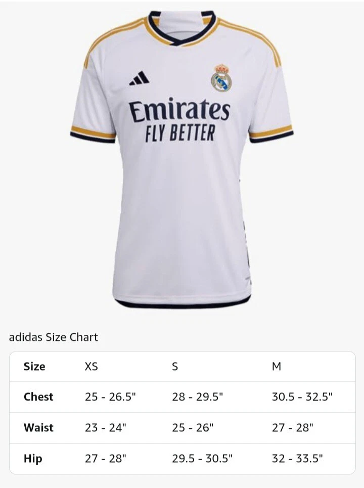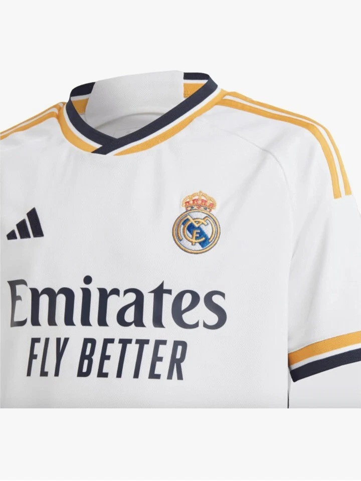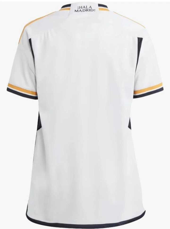 The Real Madrid 23/24 Adidas Home Jersey is a soccer jersey designed for fans of the Real Madrid team. It is in size L and features the Adidas brand logo. This jersey is specifically for supporters of Real Madrid looking to show their team pride during matches or as casual wear.