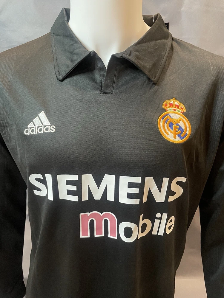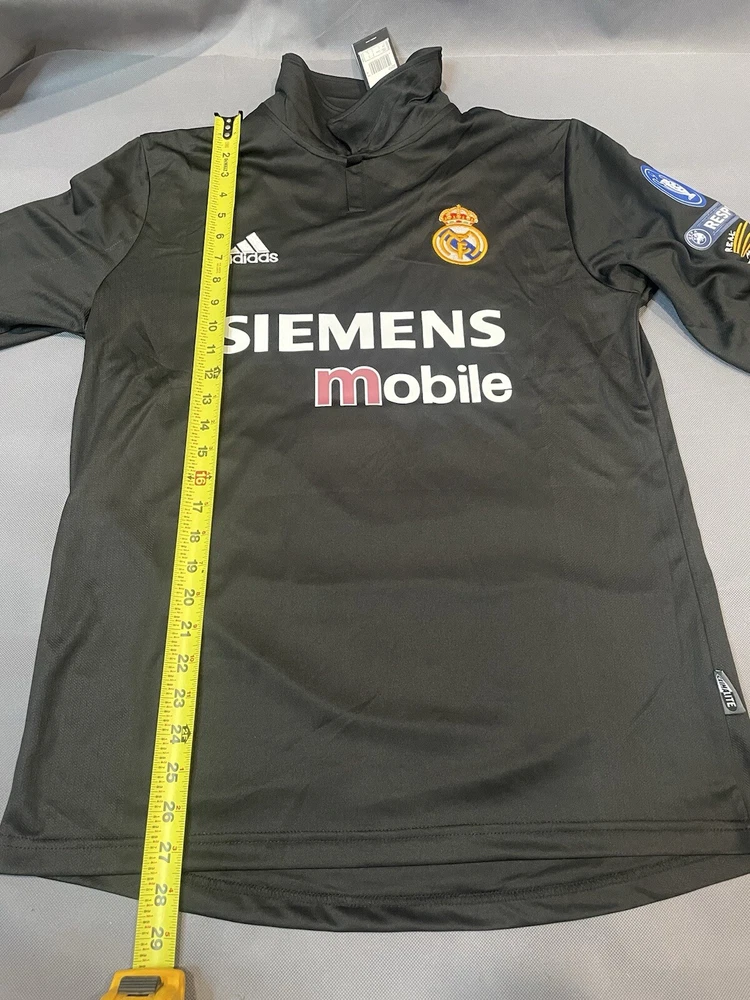 Immerse yourself in the glory of Real Madrid's historic era with this retro 02/03 away jersey, featuring the legendary Zinedine Zidane's name and number, #5. A must-have for any soccer aficionado, this black jersey celebrates the finesse of La Liga giants with a timeless design. Tailored to a men's large size, it offers both comfort and a stylish tribute to the sport. Whether you're cheering from the stands or reliving classic football moments at home, this jersey is perfect for fans who appreciate the sport's rich history. Its long sleeves make it an ideal choice for cooler weather, ensuring you can display your team pride year-round. With a capacity to hold 8 oz of your favorite beverage, it's also practical for game day essentials. Order as soon as possible to receive before holidays if you have any questions lemme know!