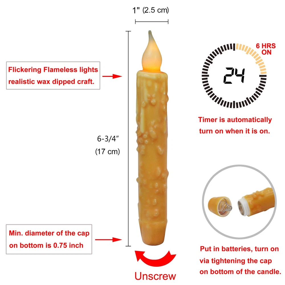 Flickering flameless lights bringing warm and pleasant to brighten sweet home. Decorative accents give you a cozy ambiance for any place you want, romantic and safe. Illuminate the fireplace mantel, countertop, bookshelf, tabletop, cabin, window with LED Flickering Flameless candles in candlestick. Great idea for home decorations, holiday decoration, Christmas, Thanksgiving, Halloween, New Year, Valentine's Day, dinner parties, wedding, birthday party, church, candle lights vigil, flower arrangement, other festival celebrate and more. Perfect gifts for family, friends, neighbors and acquaintances. CVHOMEDECO. have many years of hand dipped experience, welcome try and compare! Made of vintage-inspired wax hand dipped handicraft and classic textured finished. The drips down like a real candle and look amazing Measures of flameless candle is 6-3/4"L x 1"D, each battery operated candle uses 2 AA batteries ( Not included ), tighten or loose the cap on bottom of the battery operated candles for ON/OFF, timer setting the candle to stay on for 6 hours and then go off for 18 hours The base of flameless candles is tapered, perfectly fit any standard taper holder and taper accessories The farmhouse tapers candle use as a decorative accent piece for countertop, tables, shelves, walls, windows, candlesticks or any room. You're sure to find lots of uses for these charming handmade candles, whether you adorn a room, use as accents piece for any crafts projects or make them to your gifts. Primitives texture wax coating and flickering candlelight, offers a softly and warm light. Perfect for home decor, holiday décor, Christmas decor, Thanksgiving present, Halloween decor, New Year, Valentine's Day, dinner parties, weddings decor, birthday party, churches, candle light vigils, floral arrangements, other festival celebrate and more