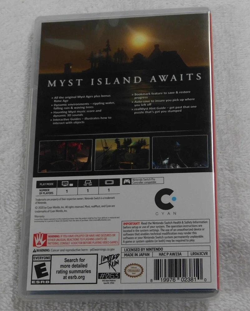 Region Code:Region FreeRating:E-EveryonePlatform:Nintendo SwitchPublisher:Limited Run Gamesbrand:Limited Run GamesRelease Year:2020Video Game Series:MystGame Name:RealmystUPC:0819976023810Genre:Puzzle, Art Game, Fantasy, Detectivegtin13:0819976023810MPN:LRS63