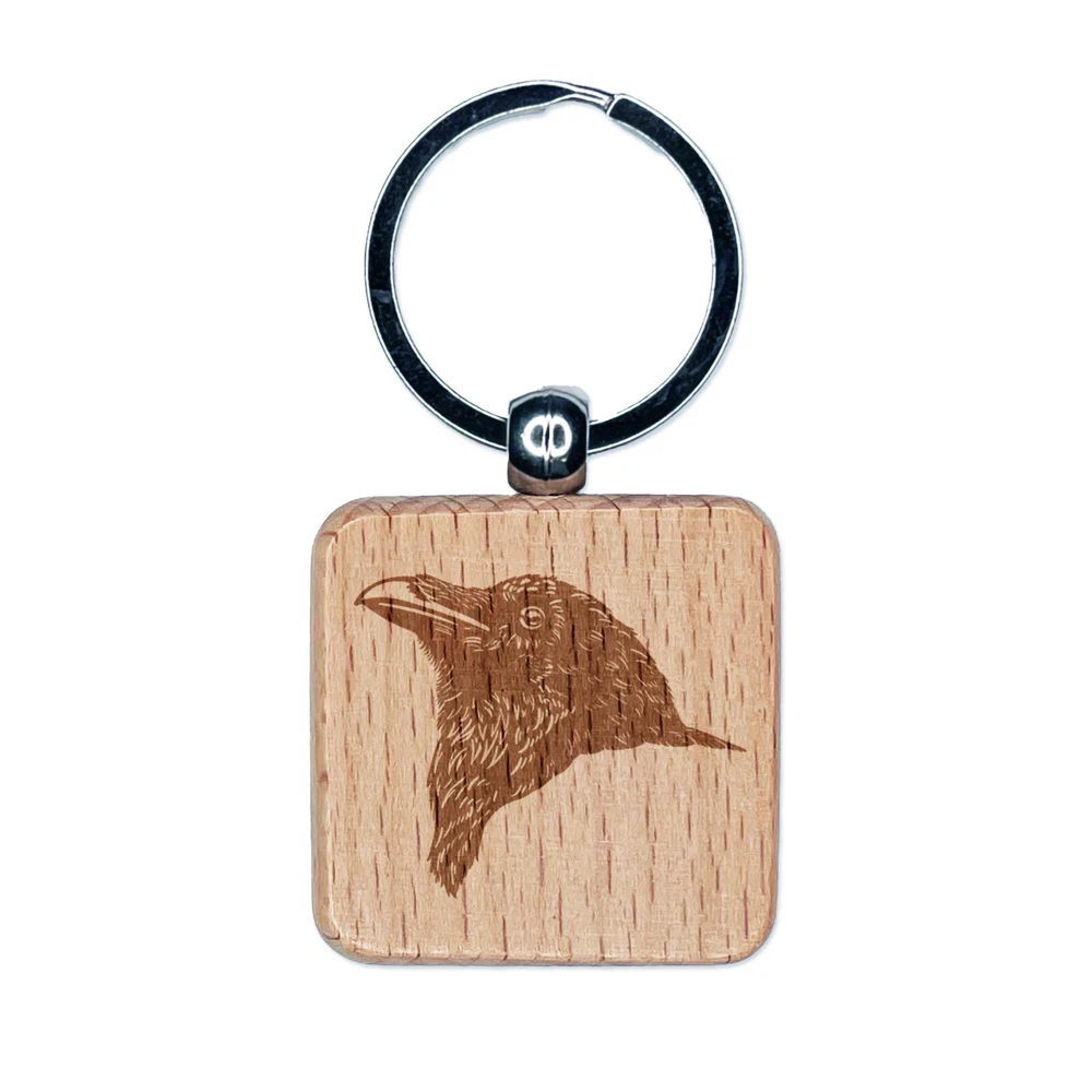 Realistic Crow Head Engraved Wood Square Keychain Tag Charm